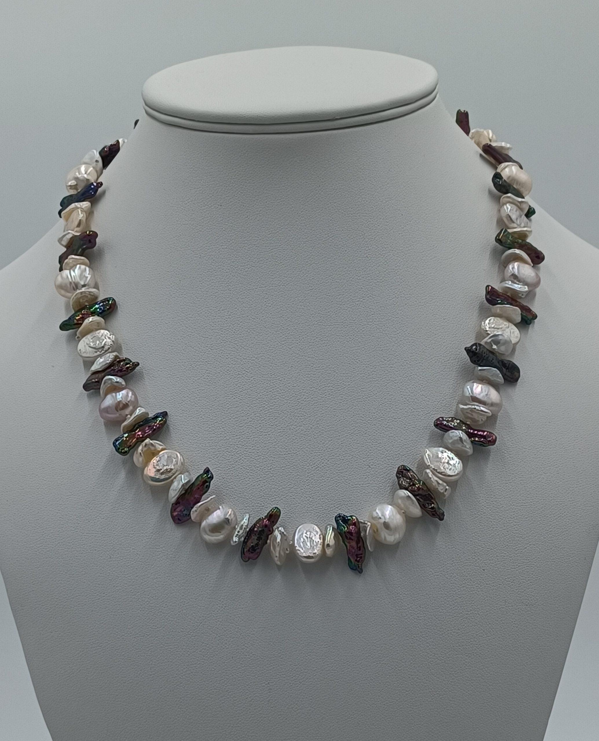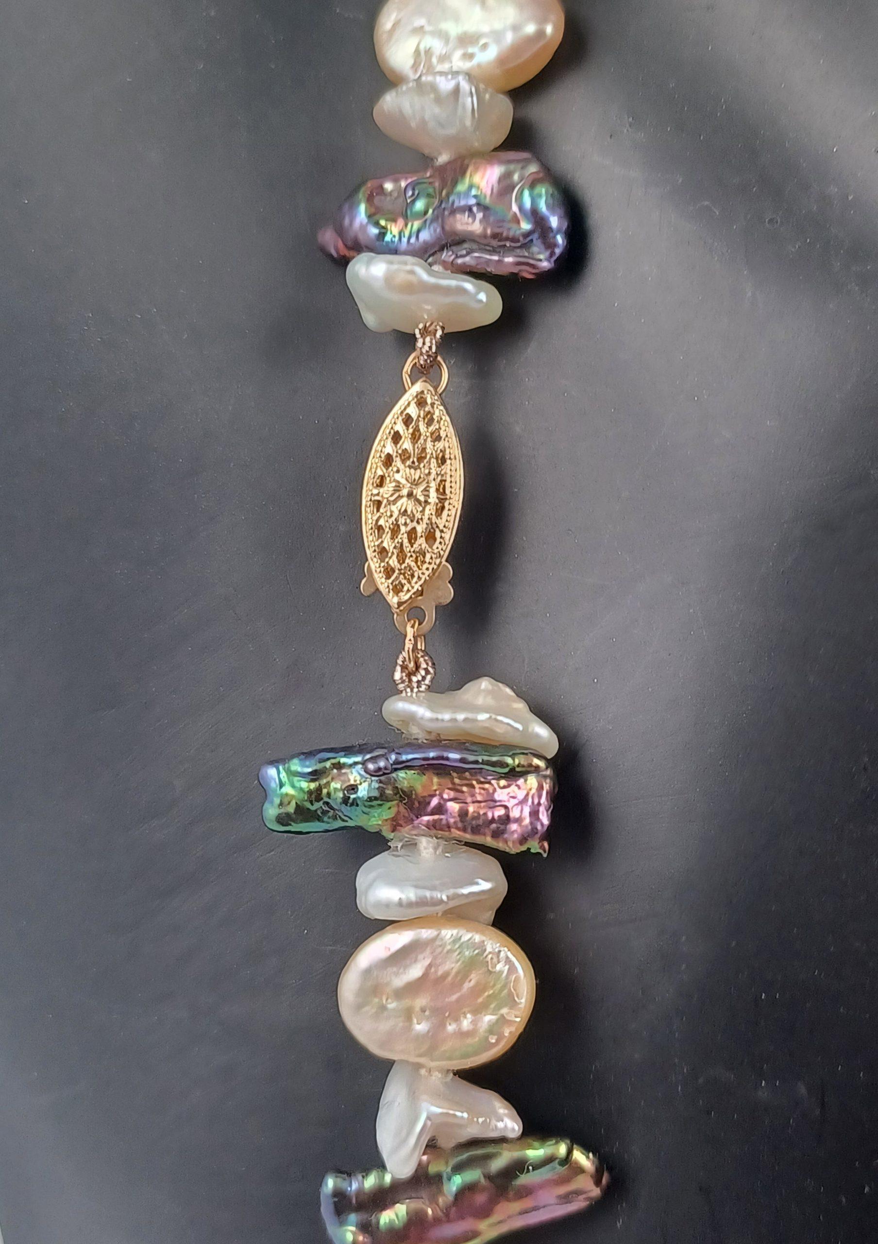 Perfection! 17.0-19.0mm Hi-luster peacock Bi-Wa pearls, 12.0mm baroque and Heshi pearl accents make this unique statement necklace a real WOW!!! 14kt gold clasp with safety feature. The variation in tones can be worn with anything. 19.5” in length.
