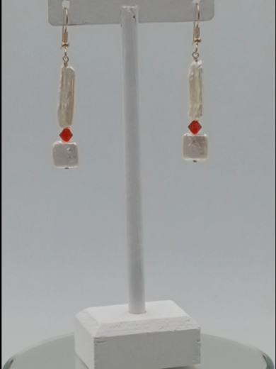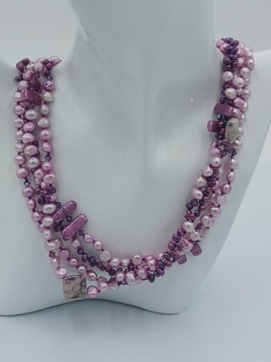 Peachy…Statement of Luxury! 11..0mm baroque cultured white pearls with Swarovski rondelles surrounds. Diamond shaped peach quartz (44mmX 34mm) center piece. 14Kt gold toggle clasp and end caps. 20mm X 25mm Peach baroque pearl teeth accents.