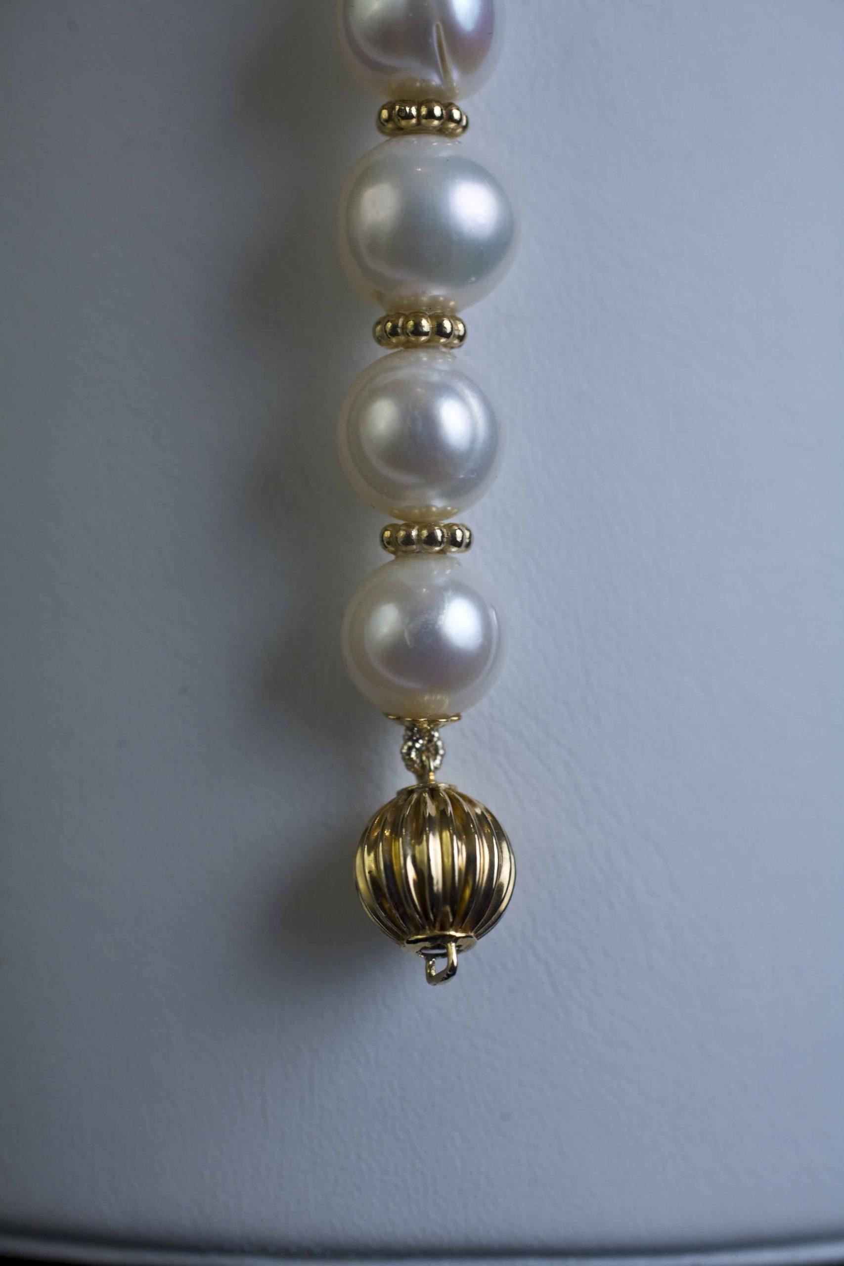 Opulence! Fabulous 10.5mm-11.0mm large round Hi-luster baroque cultured pearls. Adorned with 14kt gold Bali beads, 14kt gold round fluted clasp and end caps. WOW! 8.5” in length.