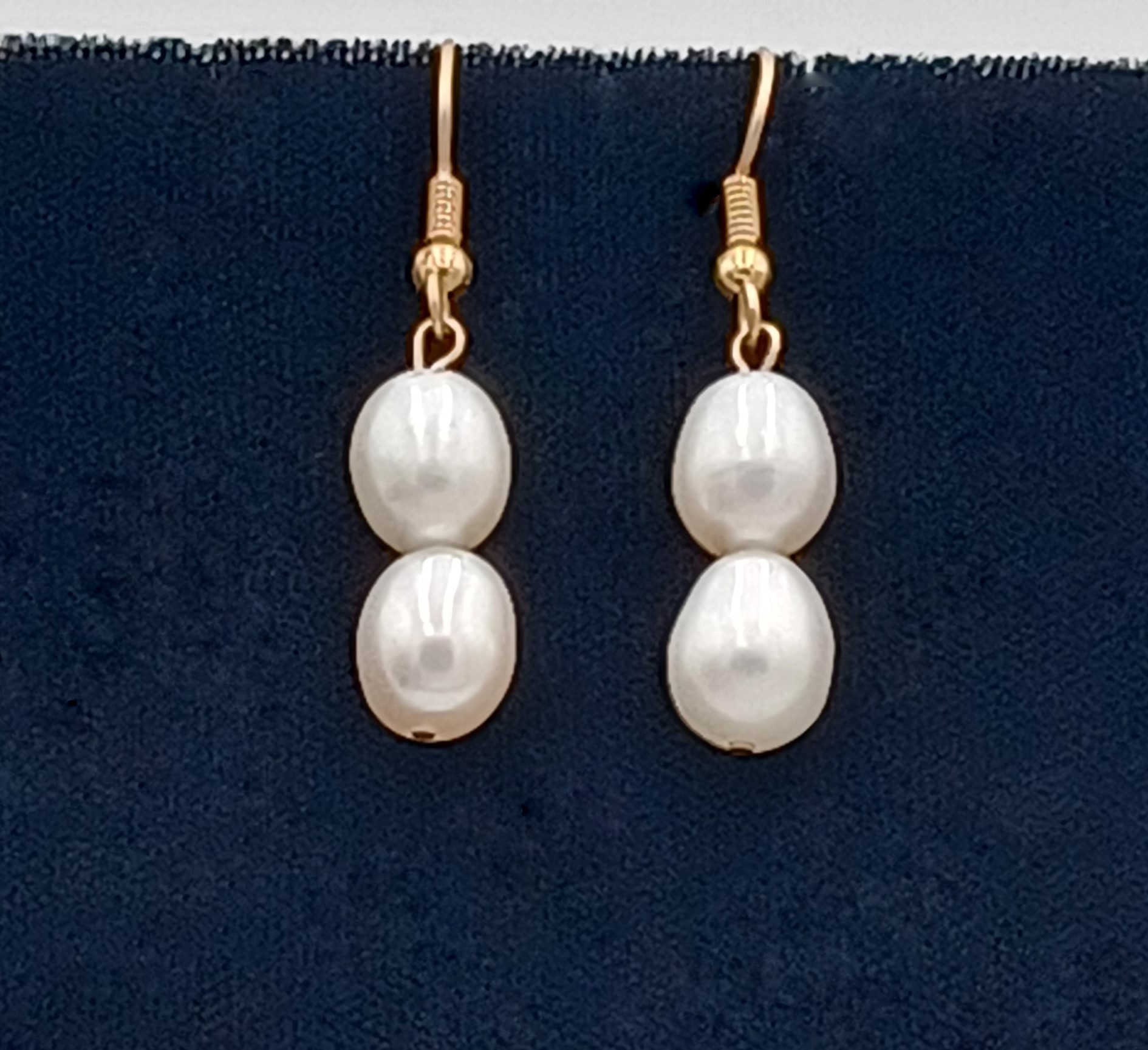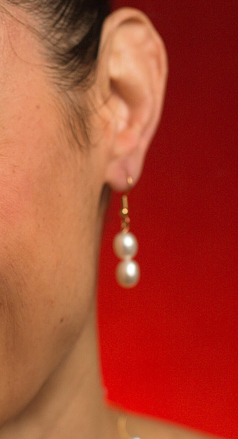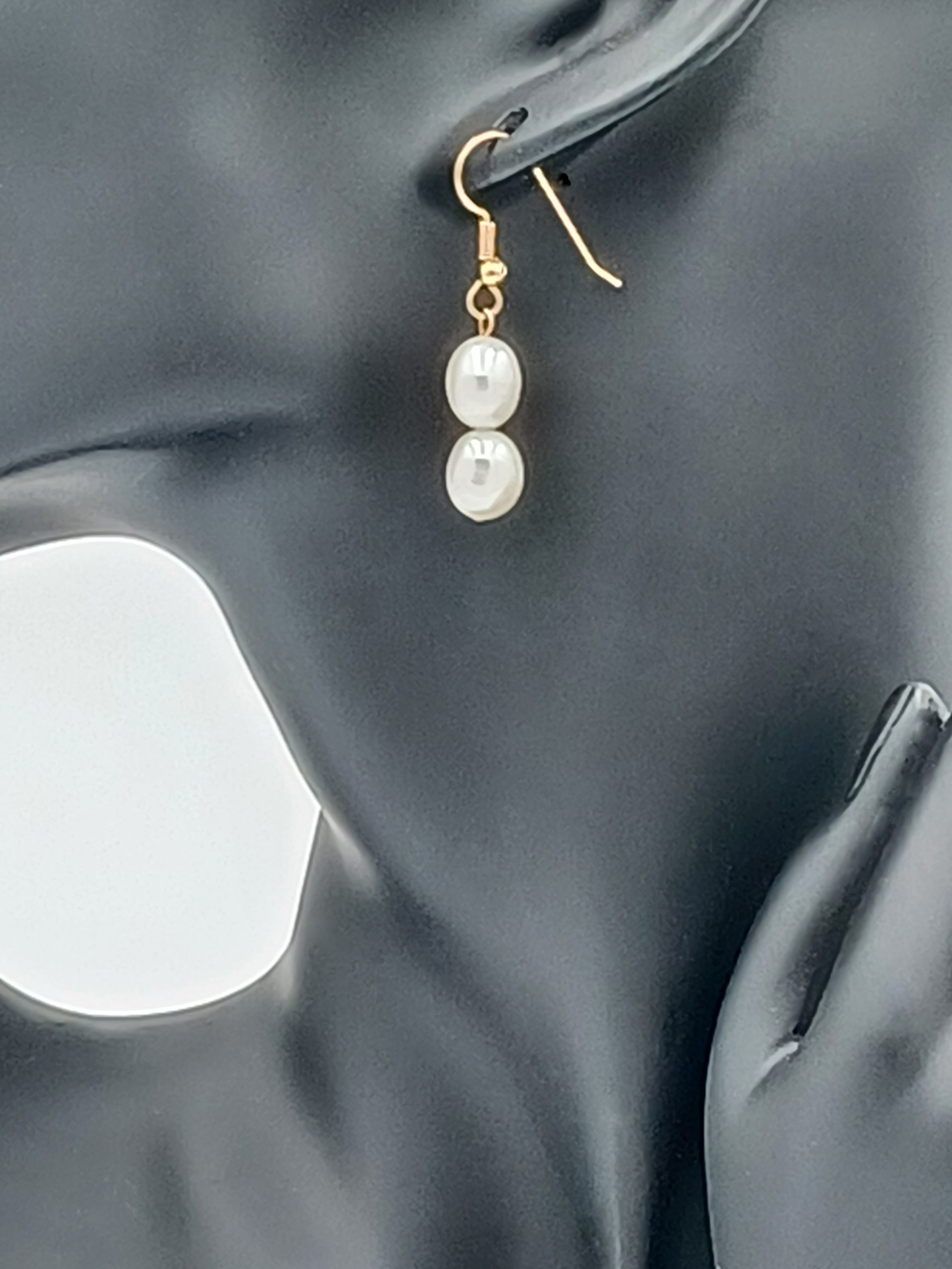 2 – Luscious 10.0mm baroque cultured pearls hanging from 14kt gold Sheppard hooks. 1.5” drop length