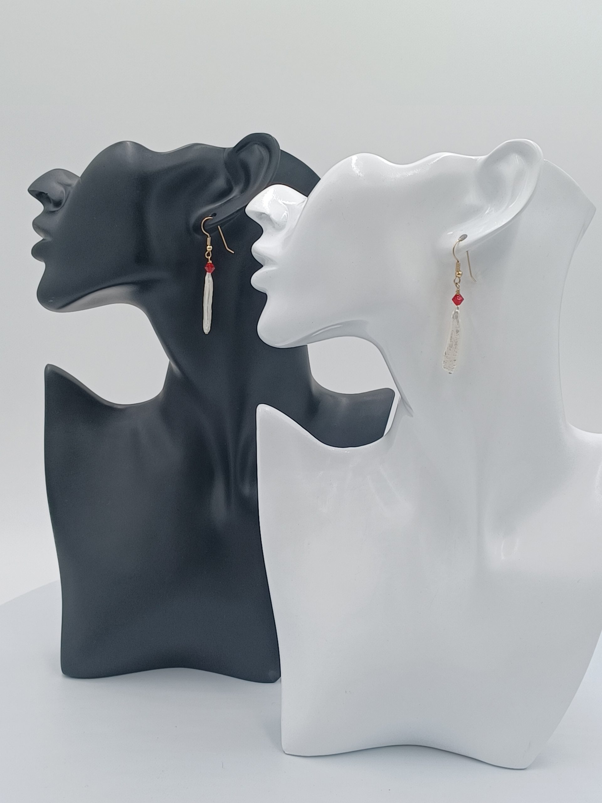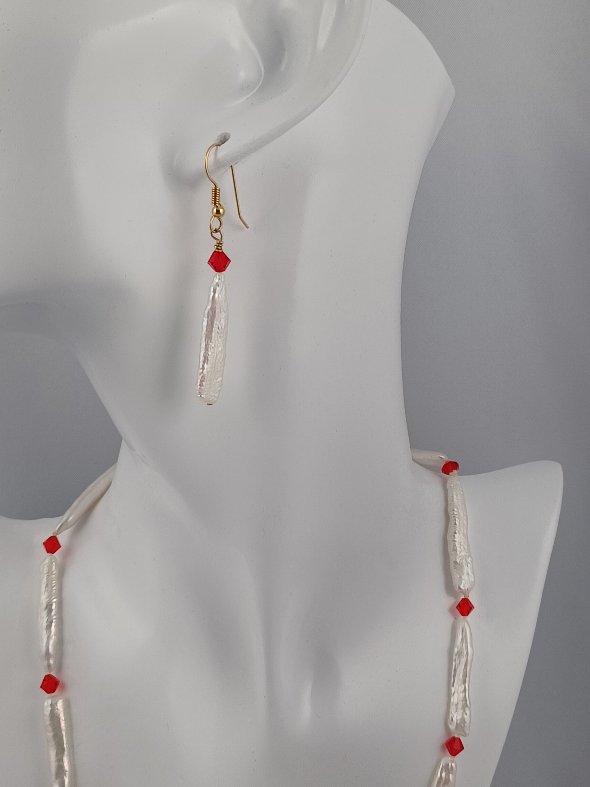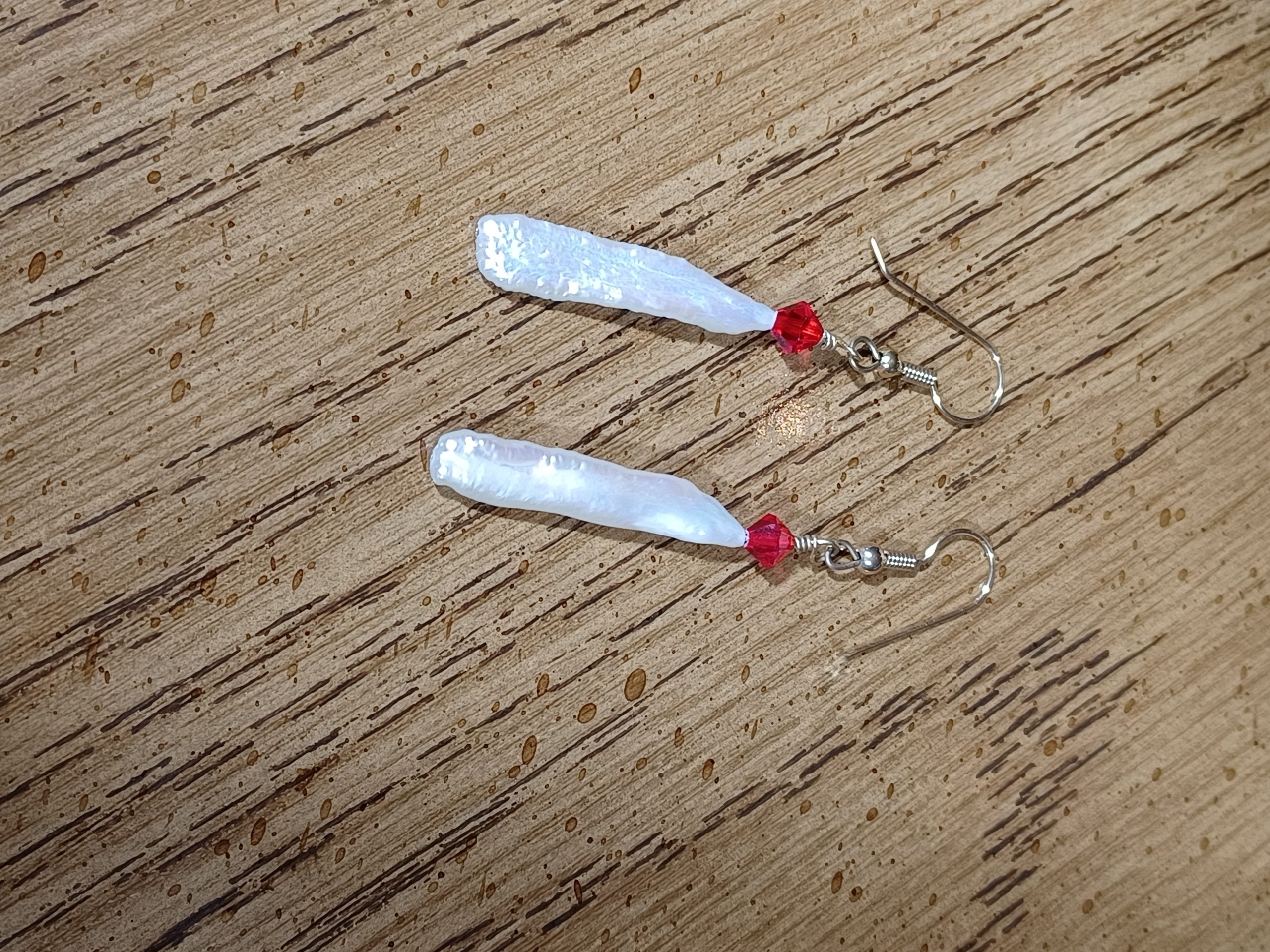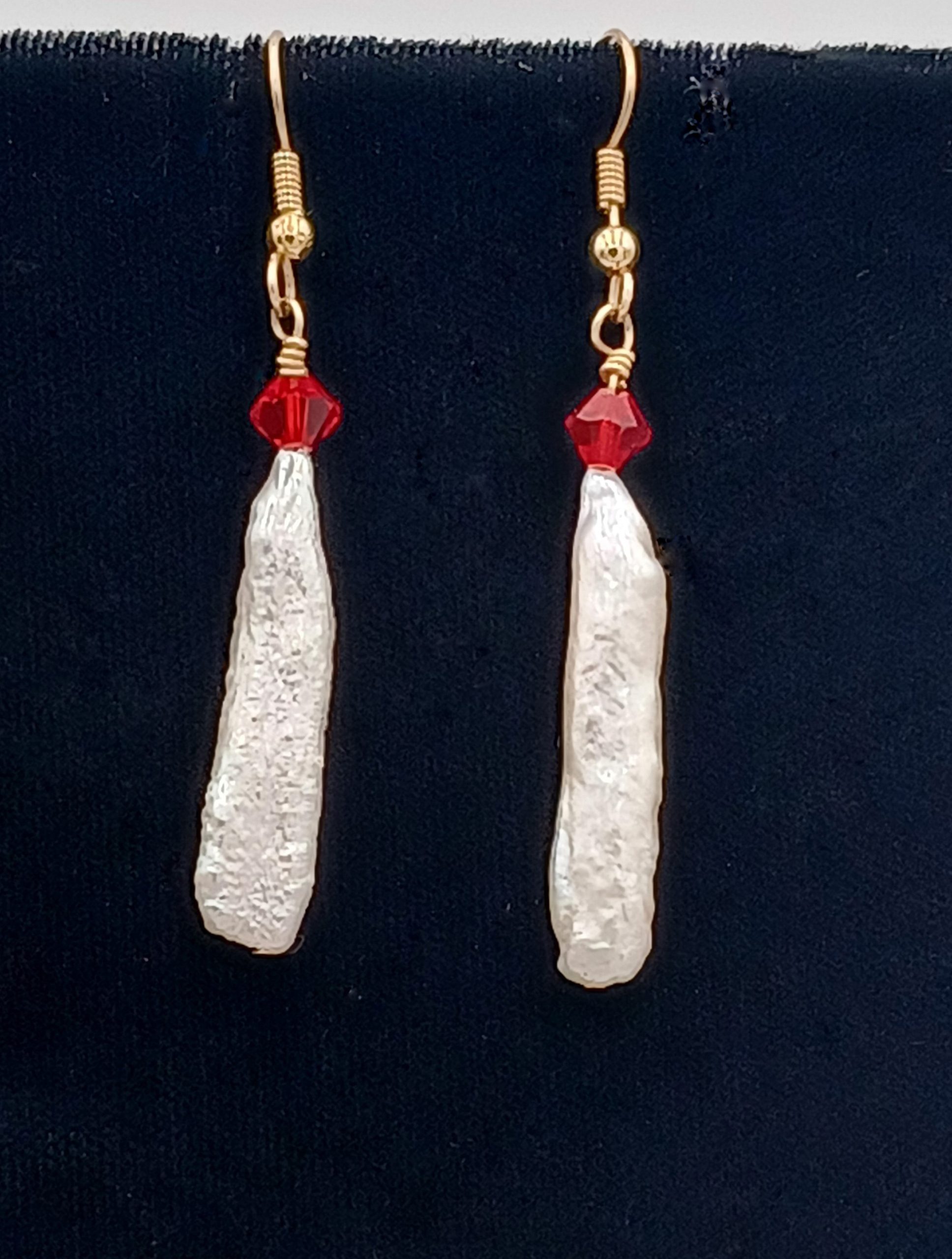 Beautiful hi-luster 29.0mm white Biwa cultured pearls with red Swarovski crystal accent. 14Kt gold Sheppard hook. 2.25 drop length. Matching necklaces available for purchase.