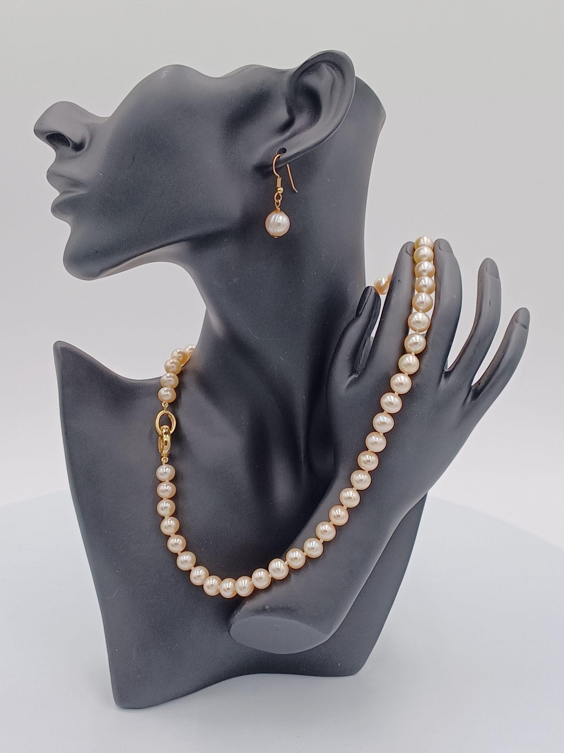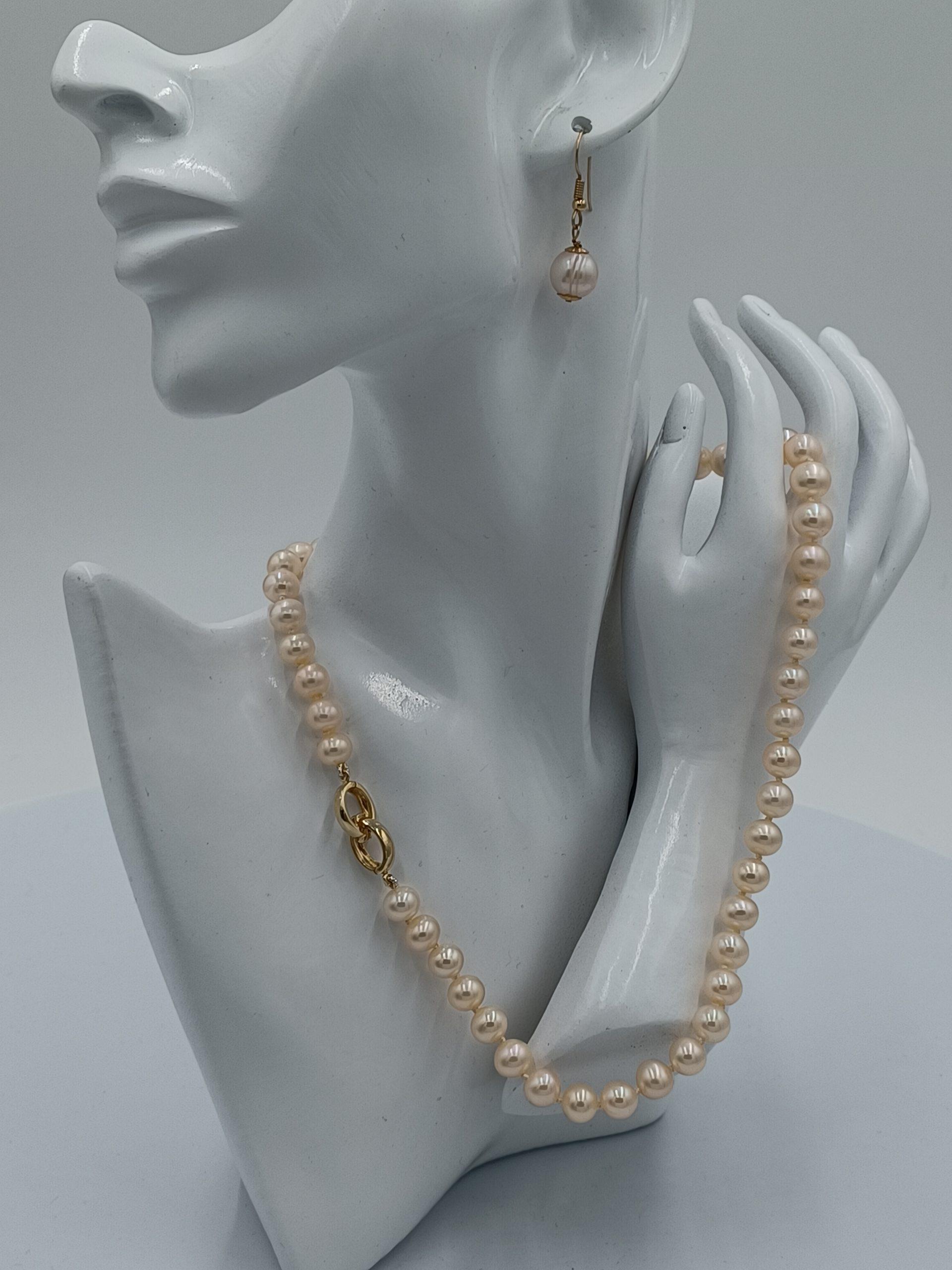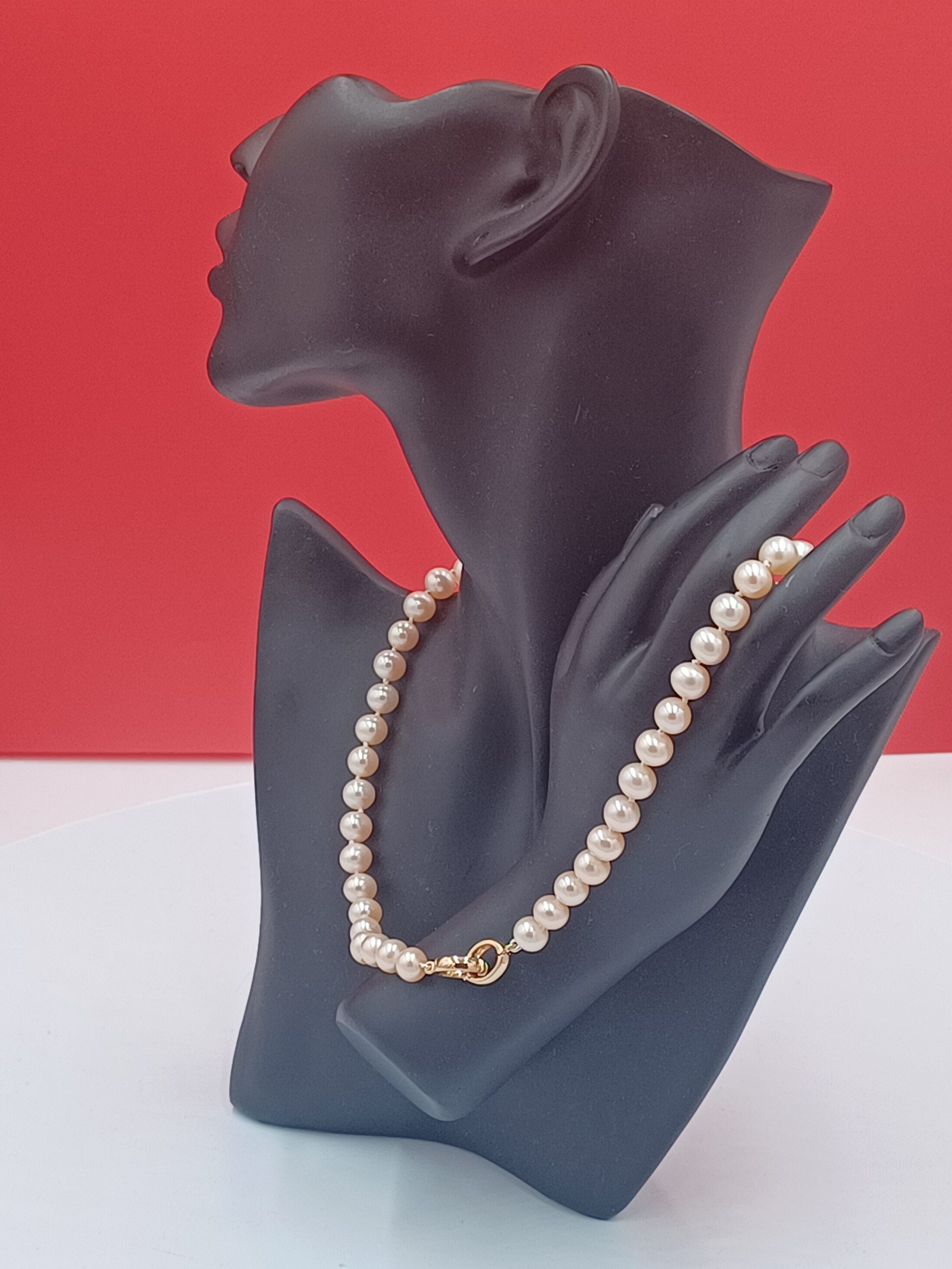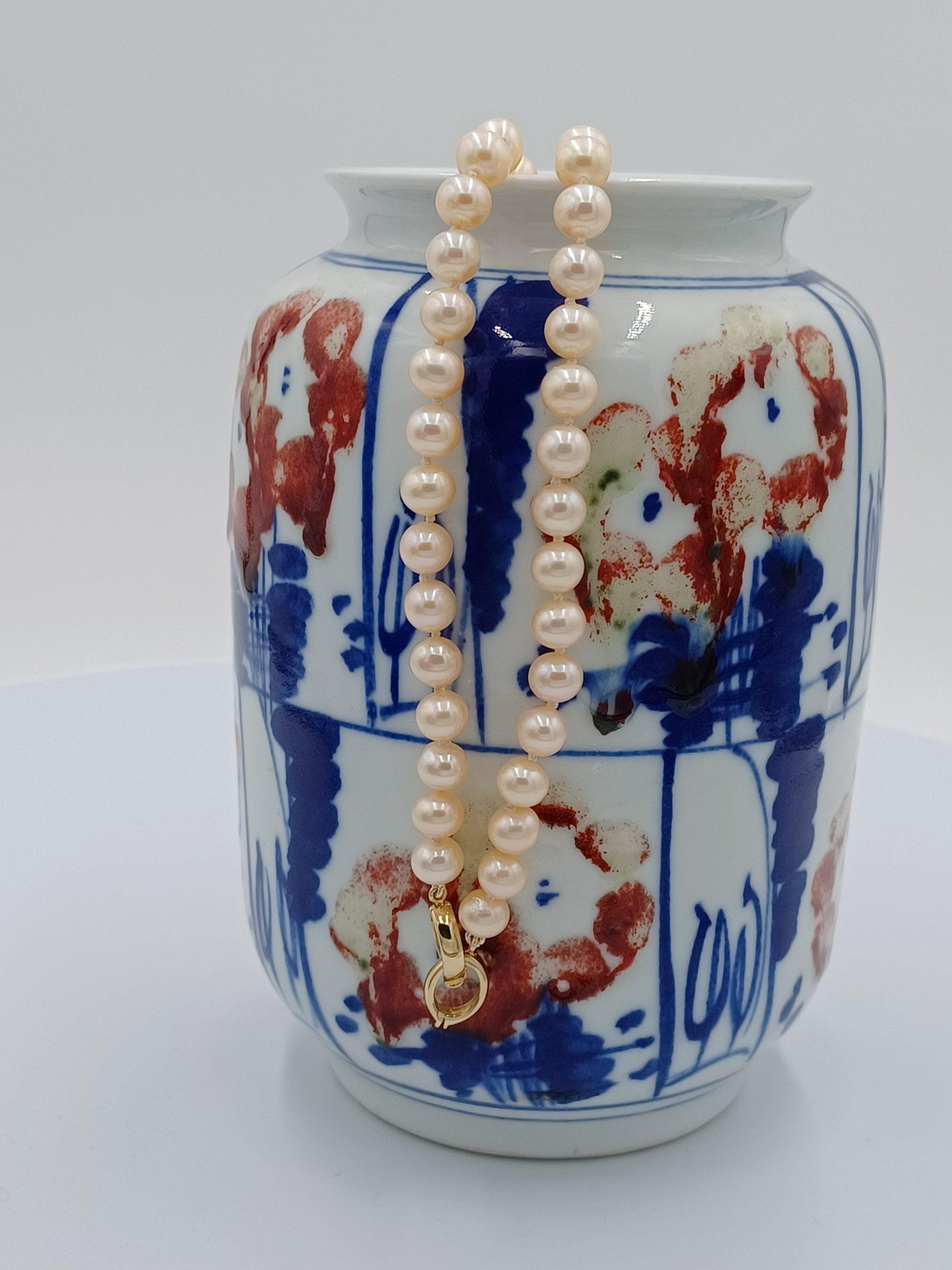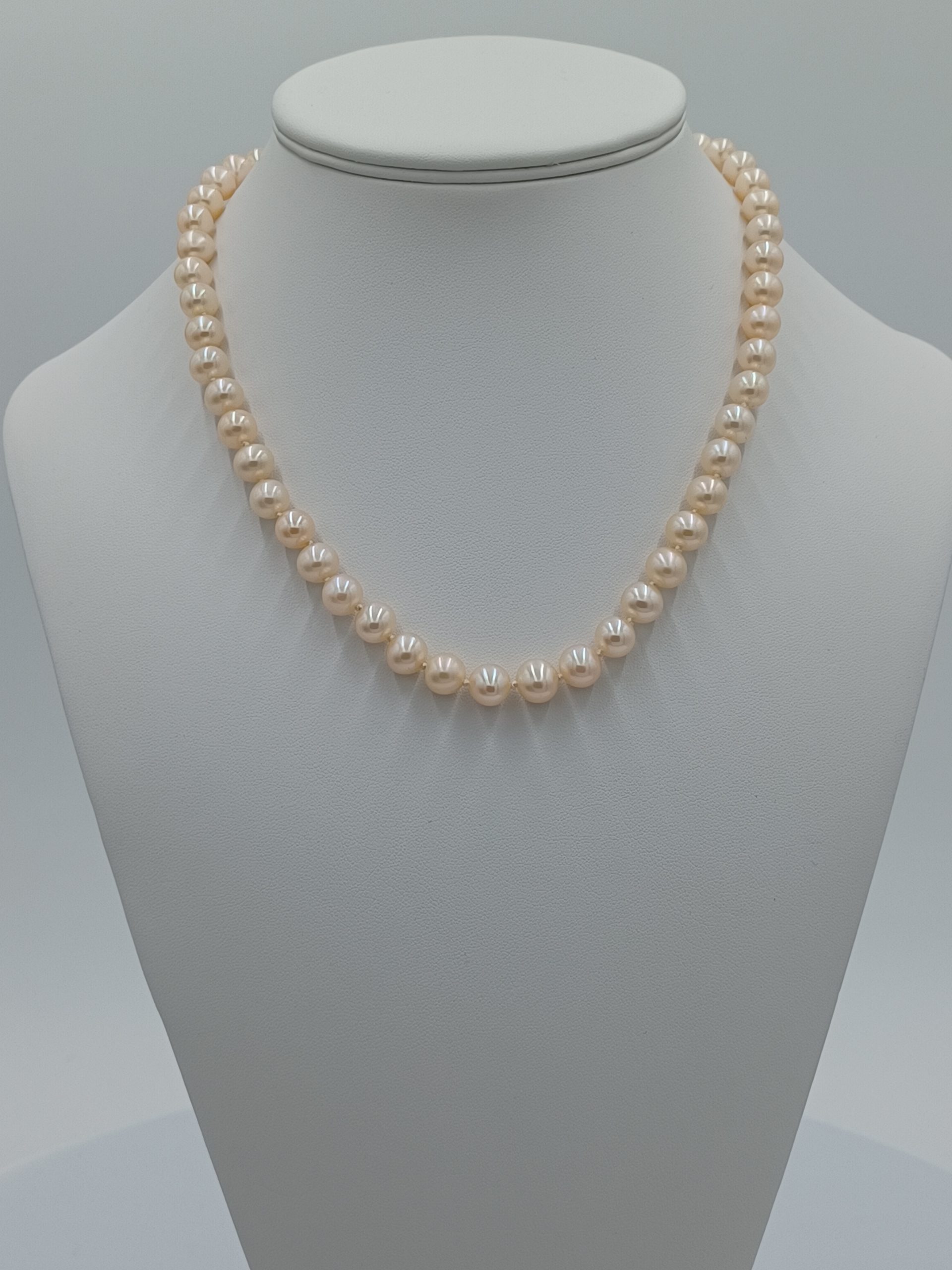 PEACHY PINK! Beautiful hi-luster 8.5mm – 9.0mm round cultured pearls. individually knotted