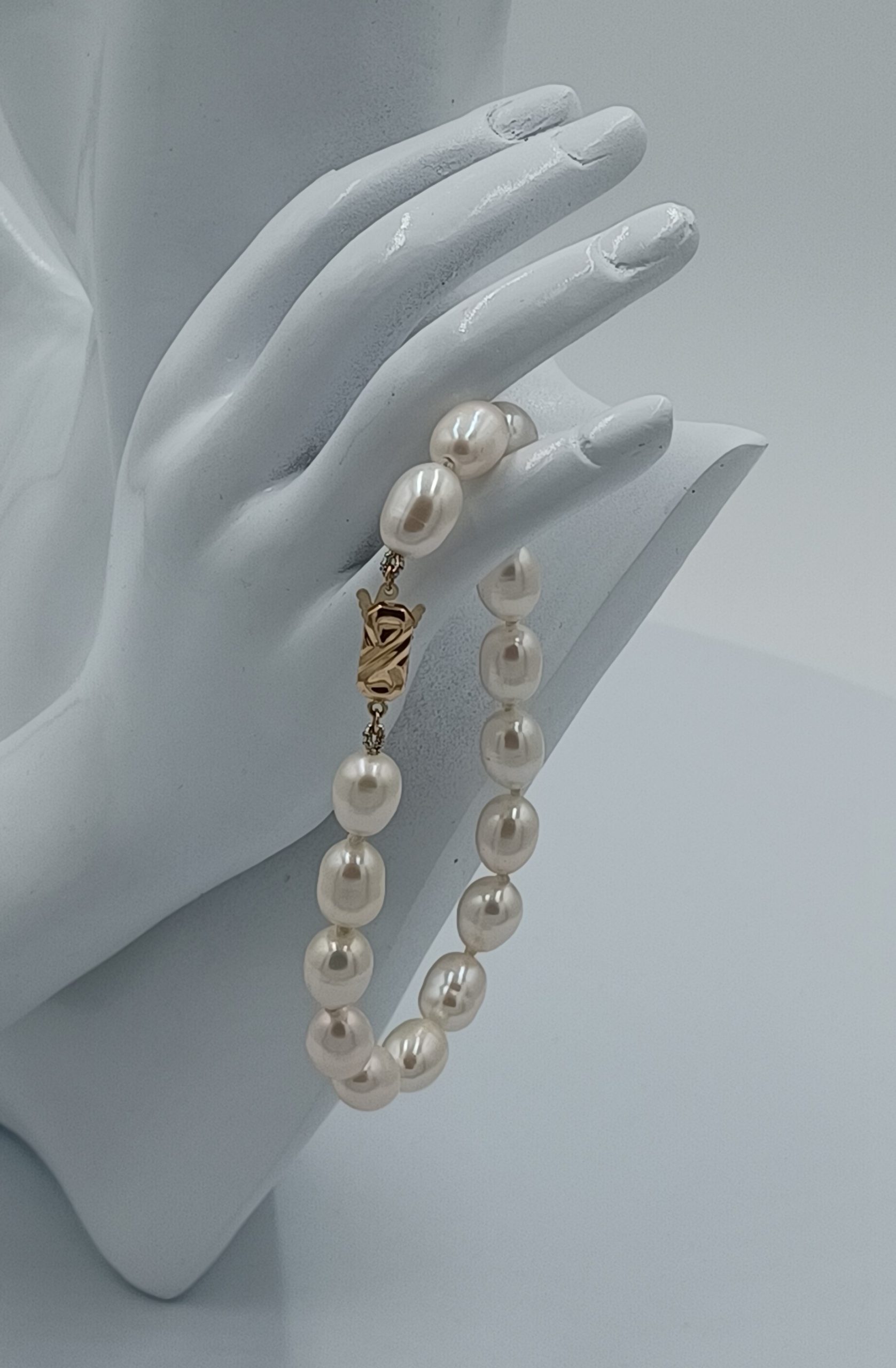 Large, luscious, Hi-luster cultured baroque white 10.5-12.5mm pearls, Chinese knotted with silk. Unique 14kt gold rectangular clasp with safety feature. 8.25” in length.