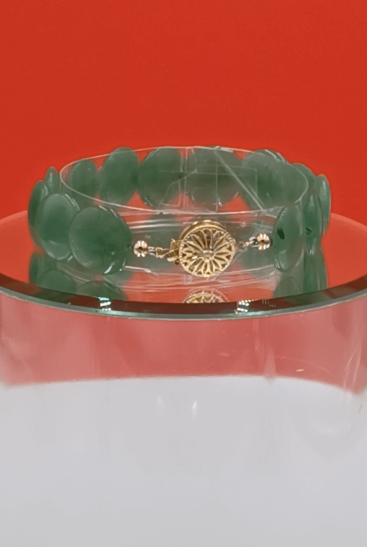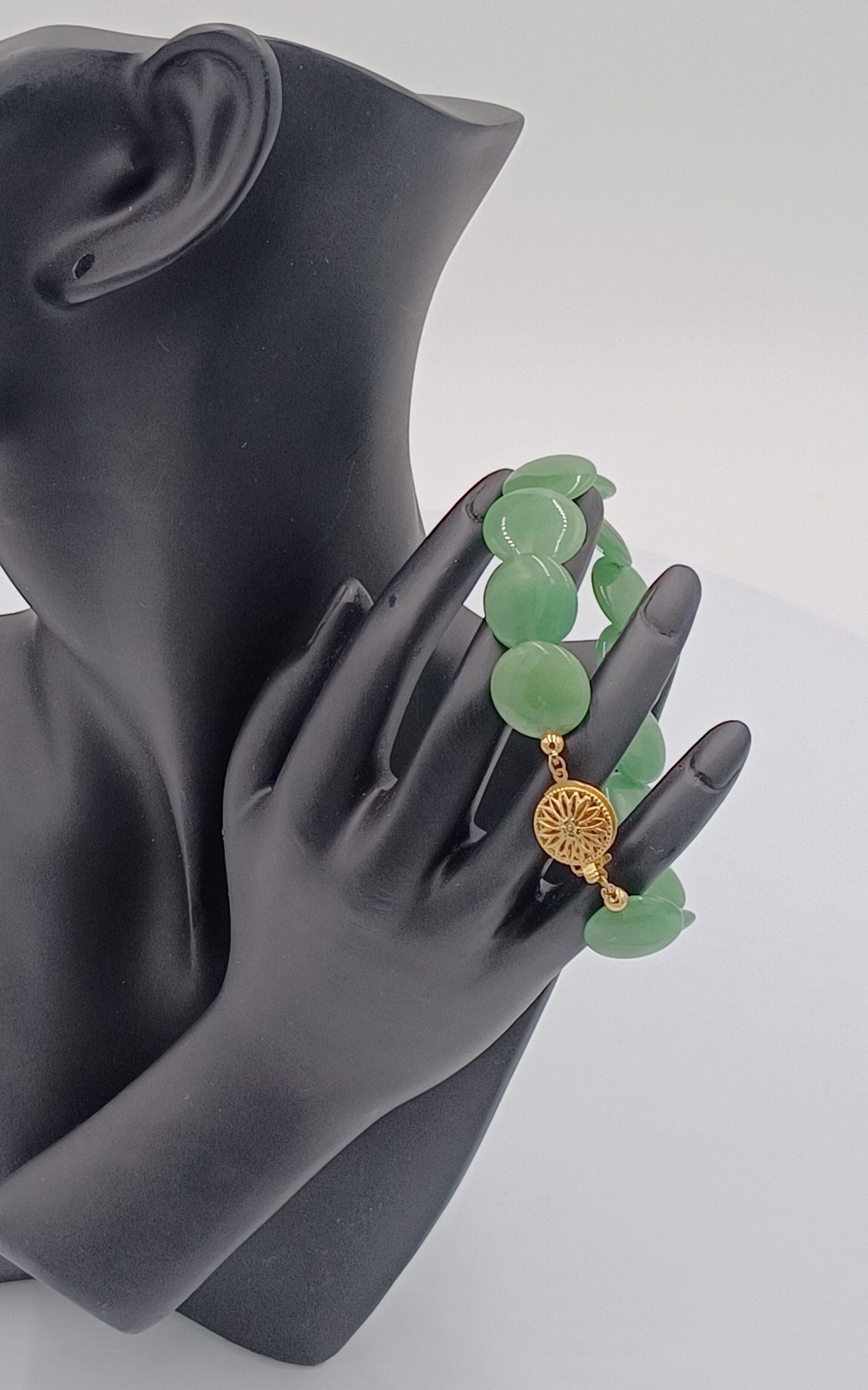 Glorious JADE! 15.5mm – 16.00mm Jade disks. A unique taste of the Orient. Beautiful 14kt gold large round filigree clasp with safety feature and 14kt gold bead accents. Individually Chinese knotted with silk. 8.5” in length. A MUST HAVE!!!!!!!