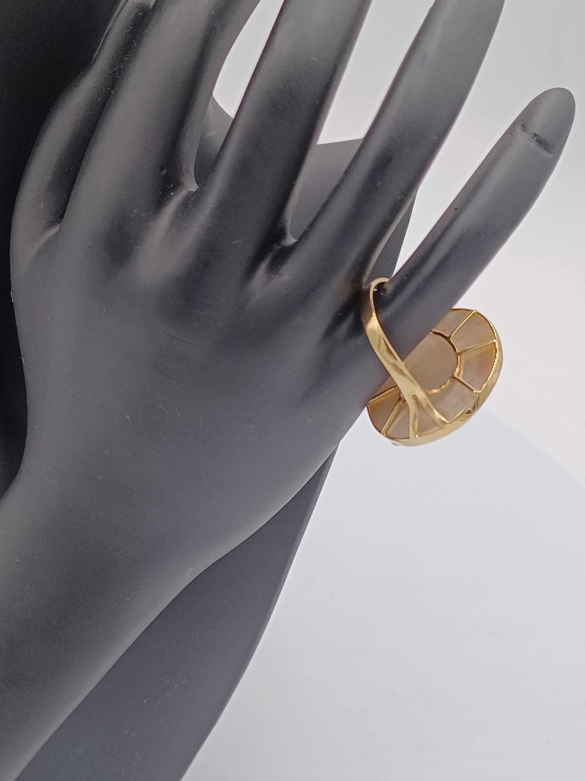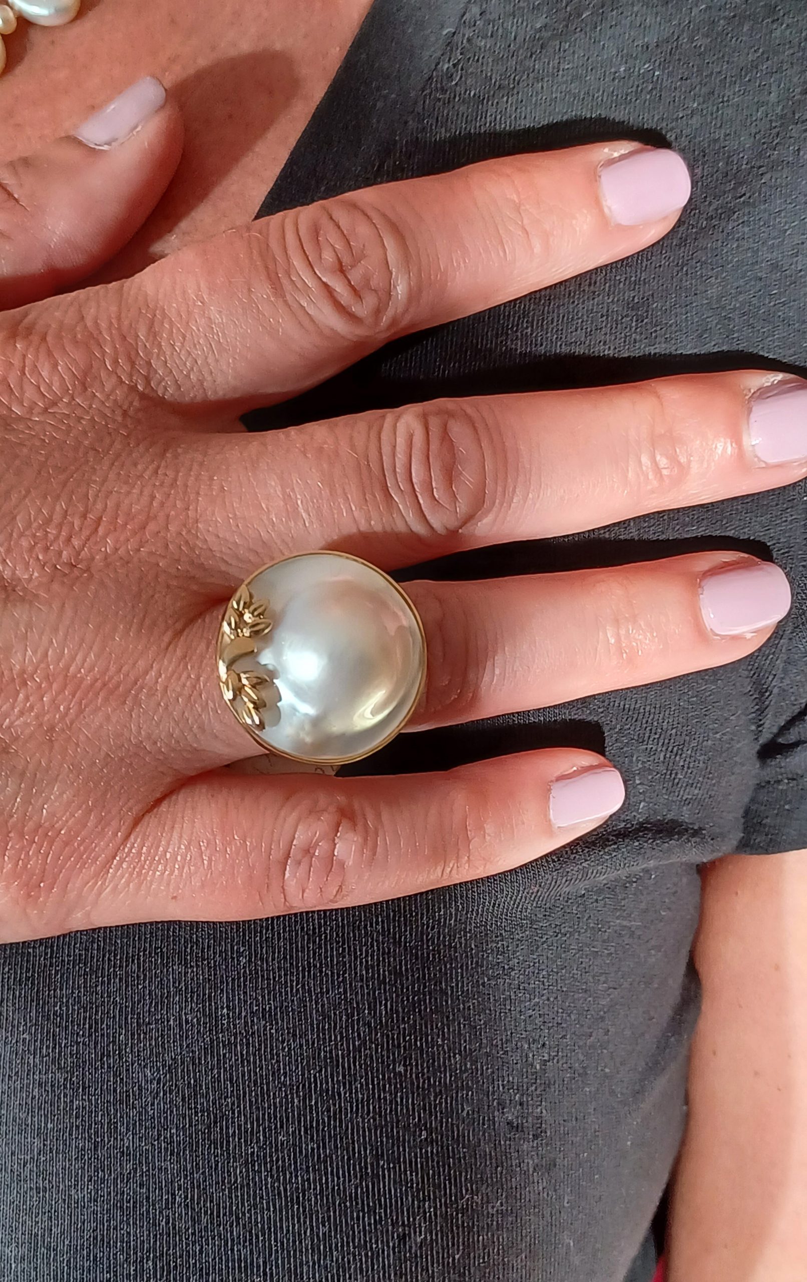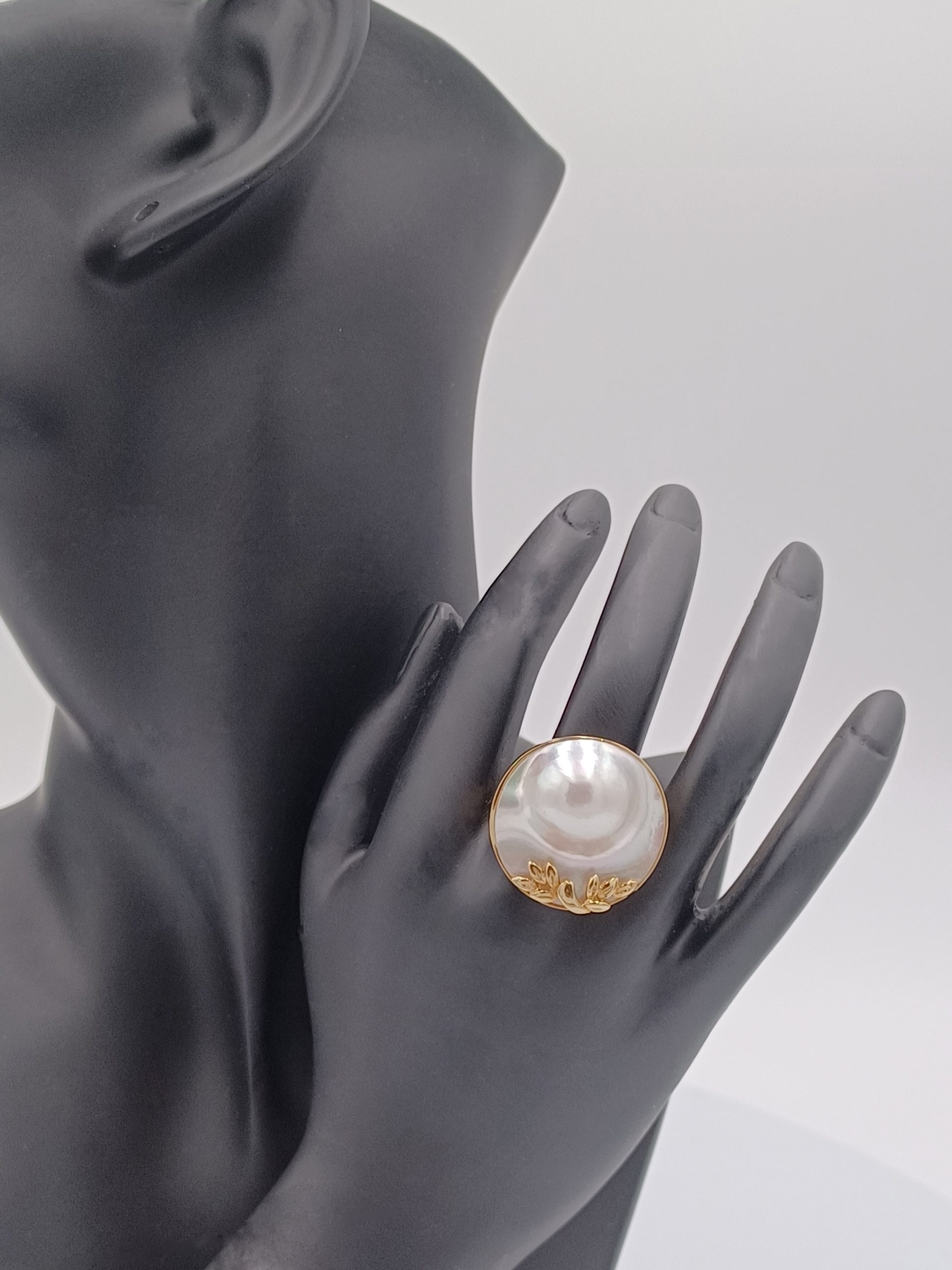 Gorgeous mid-sized MABE, hi-luster 23.0mm cultured pearl encased in 14kt gold with a beautiful leaf accent and ornate undercarriage.Size: 7.Can be resized (by a jeweler).