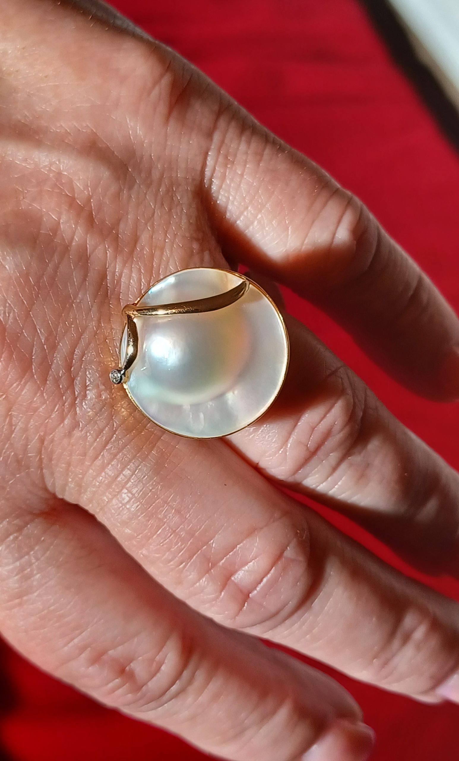 Beautiful hi-luster 21.0mm MABE cultured pearl encased in 14kt gold with swirl and diamond accent design. This creation comes with a 14kt gold undercarriage.Size: 7.5-7.75.Can be