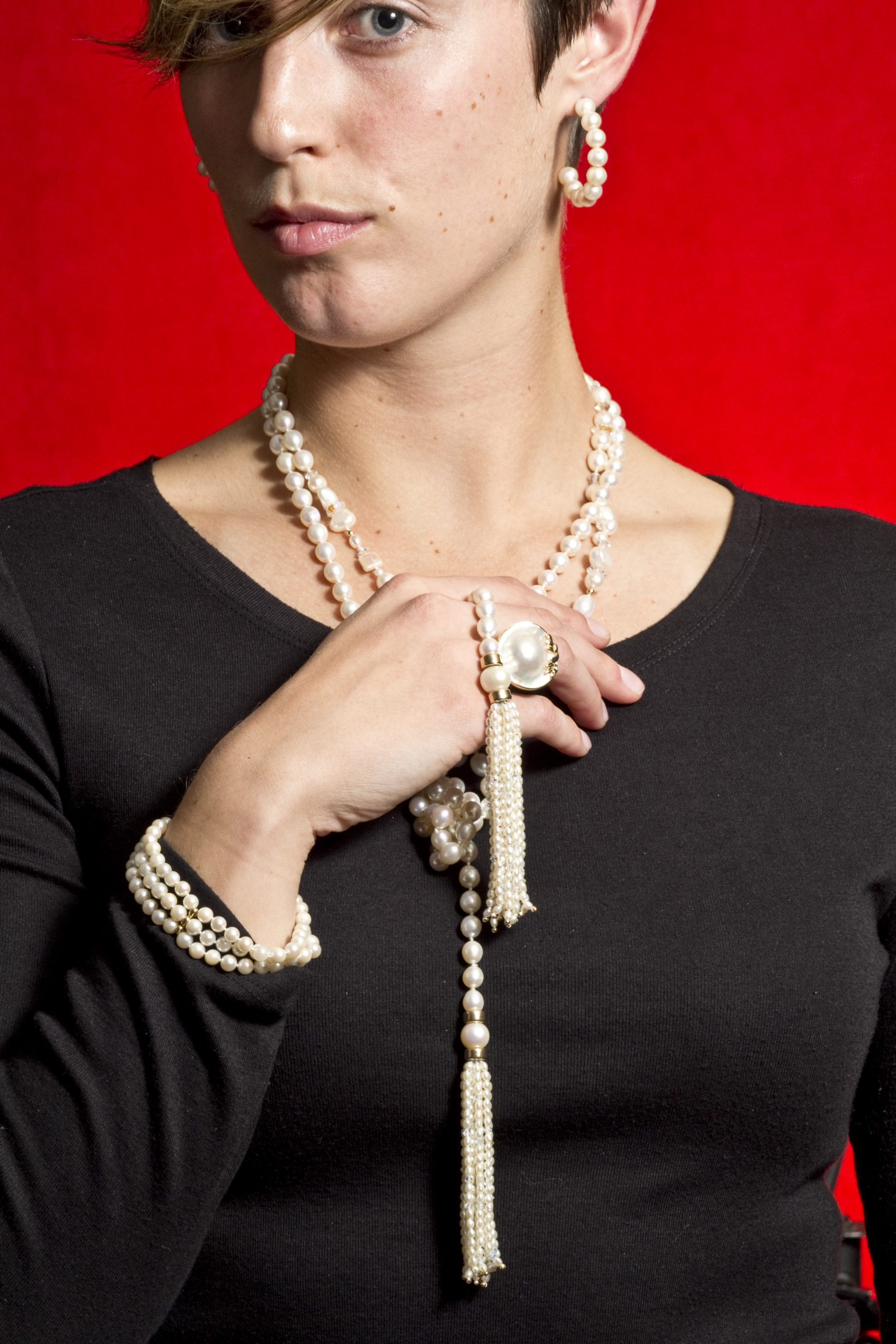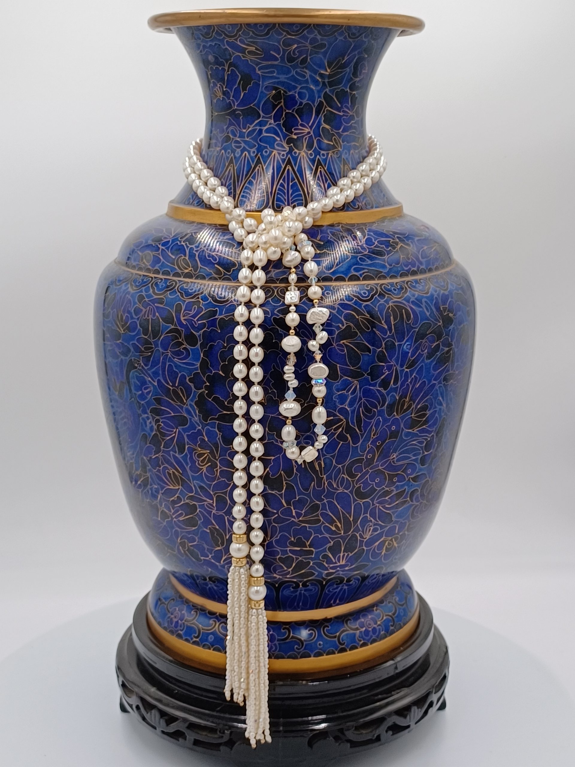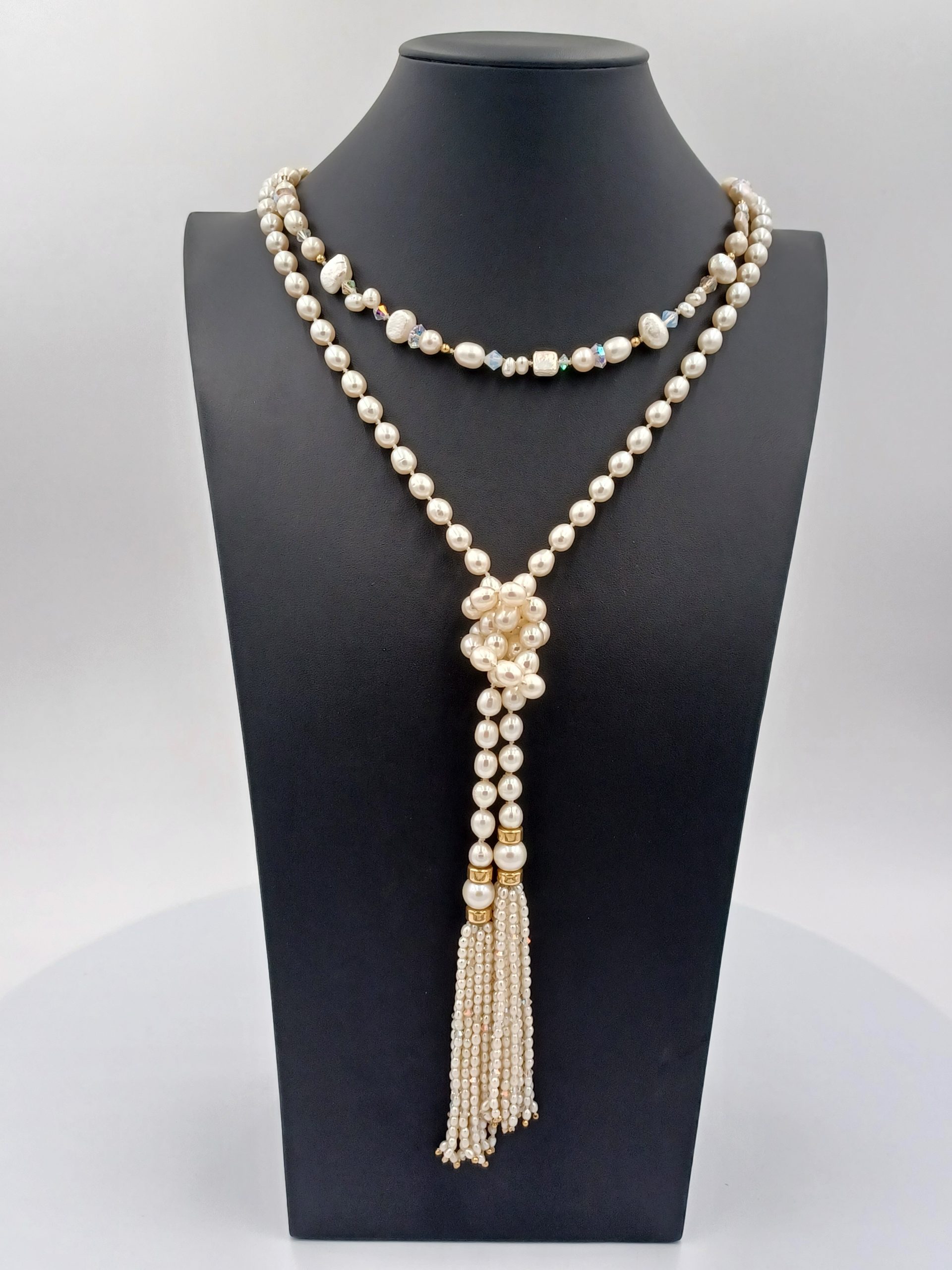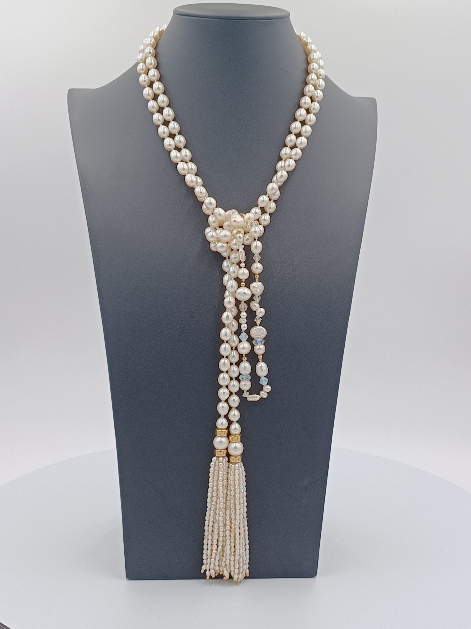 The Fringe has small pearls with Swarovski crystal with 14kt gold bead tips. 71” in length.