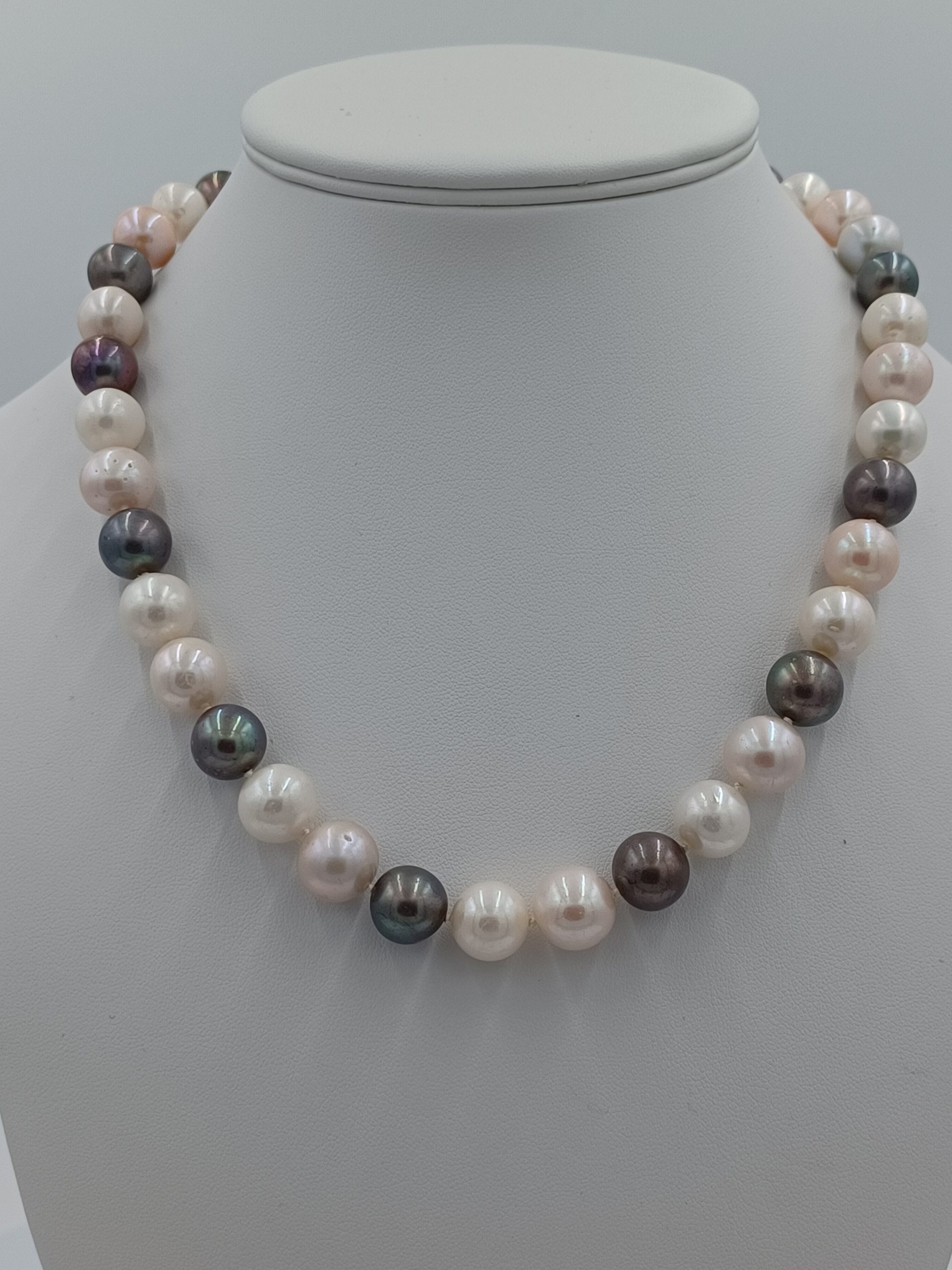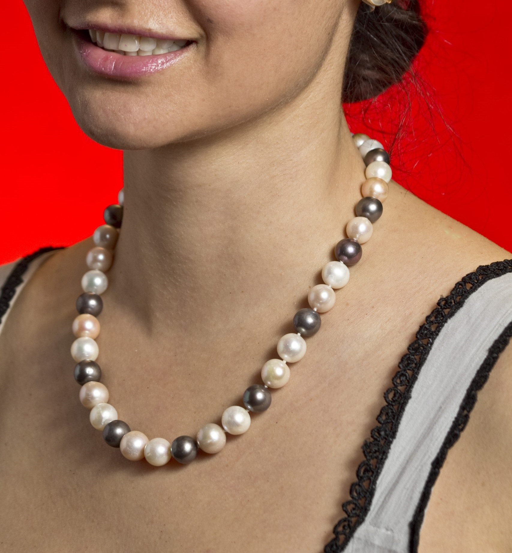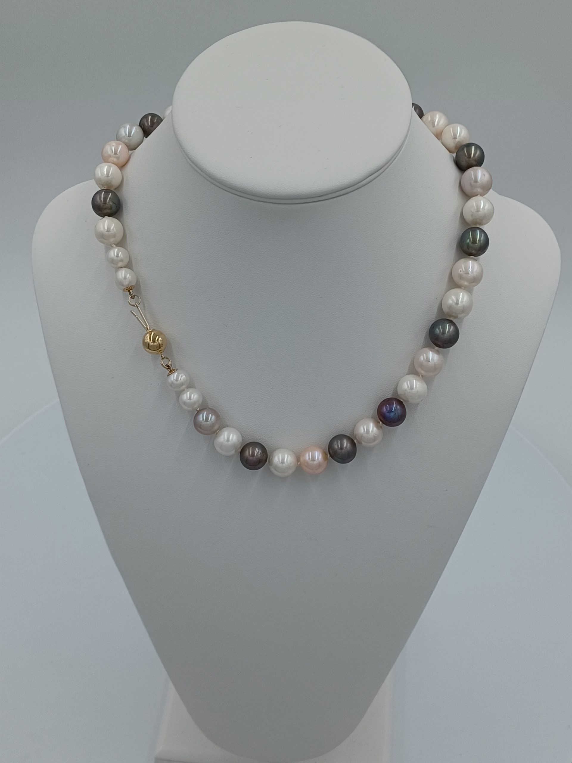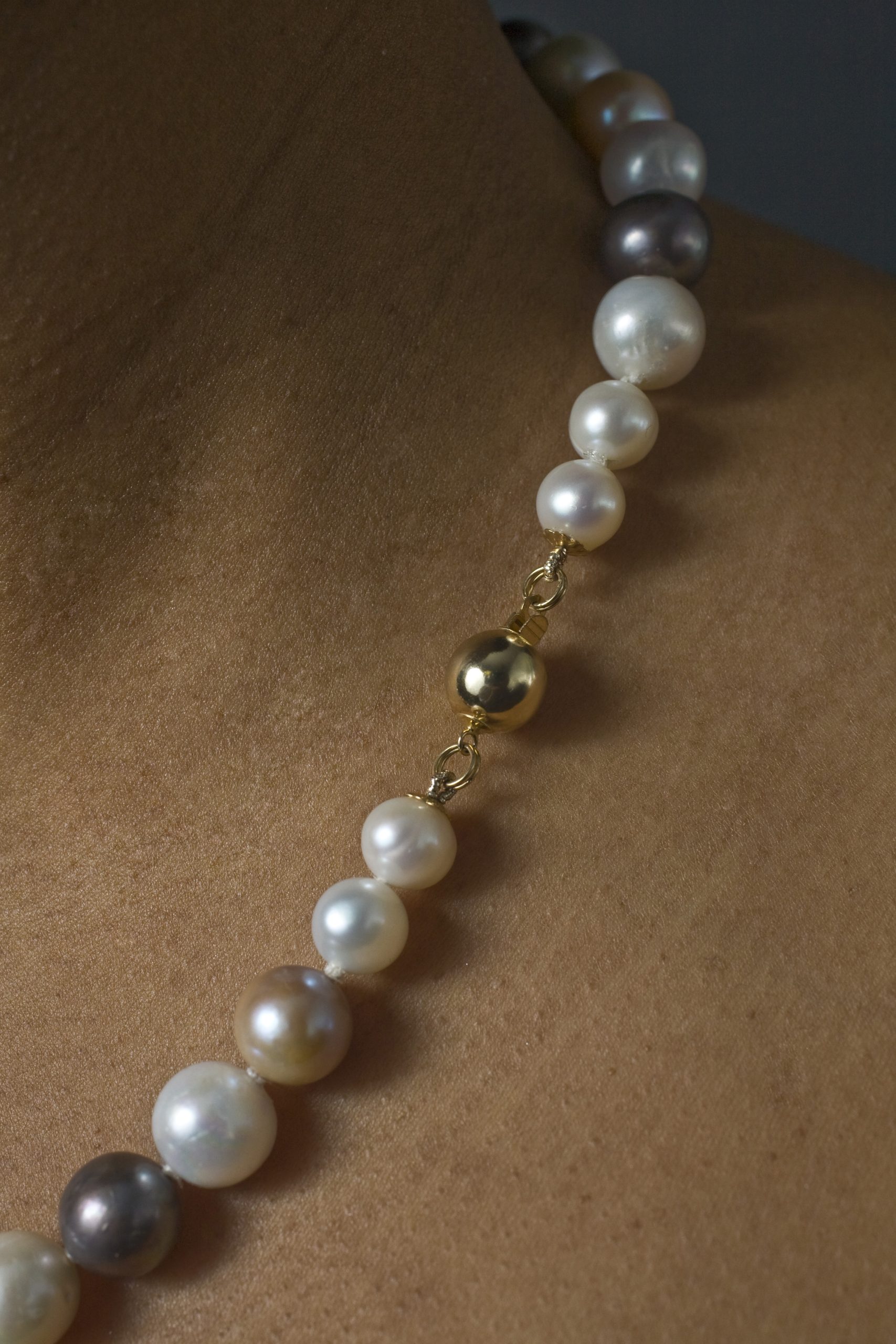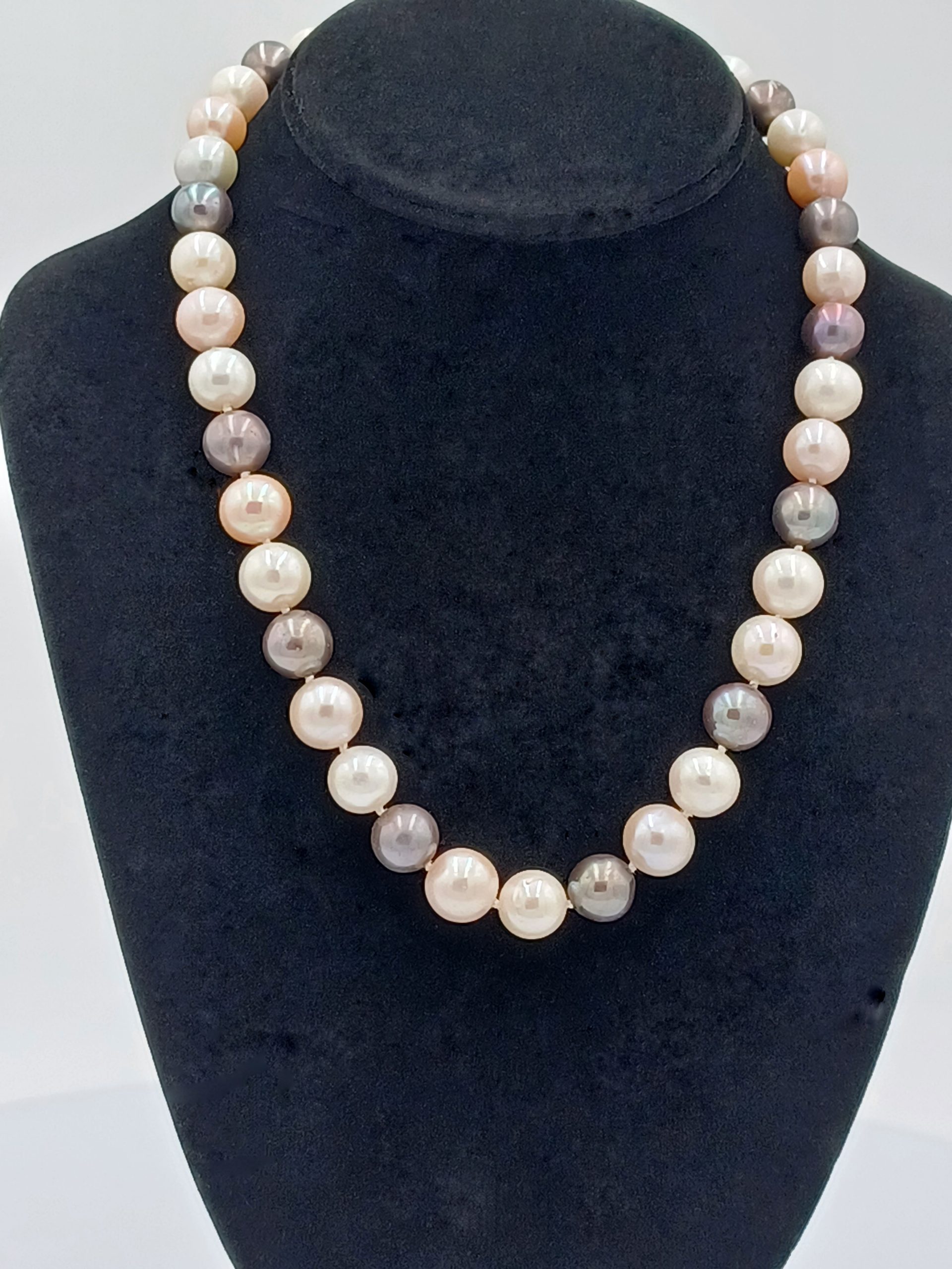Luscious 12.0mm multi-color large round freshwater cultured pearls with 9.5mm accent pearls. 14Kt gold ball clasp with safety feature and 14kt end caps. 20” in length.