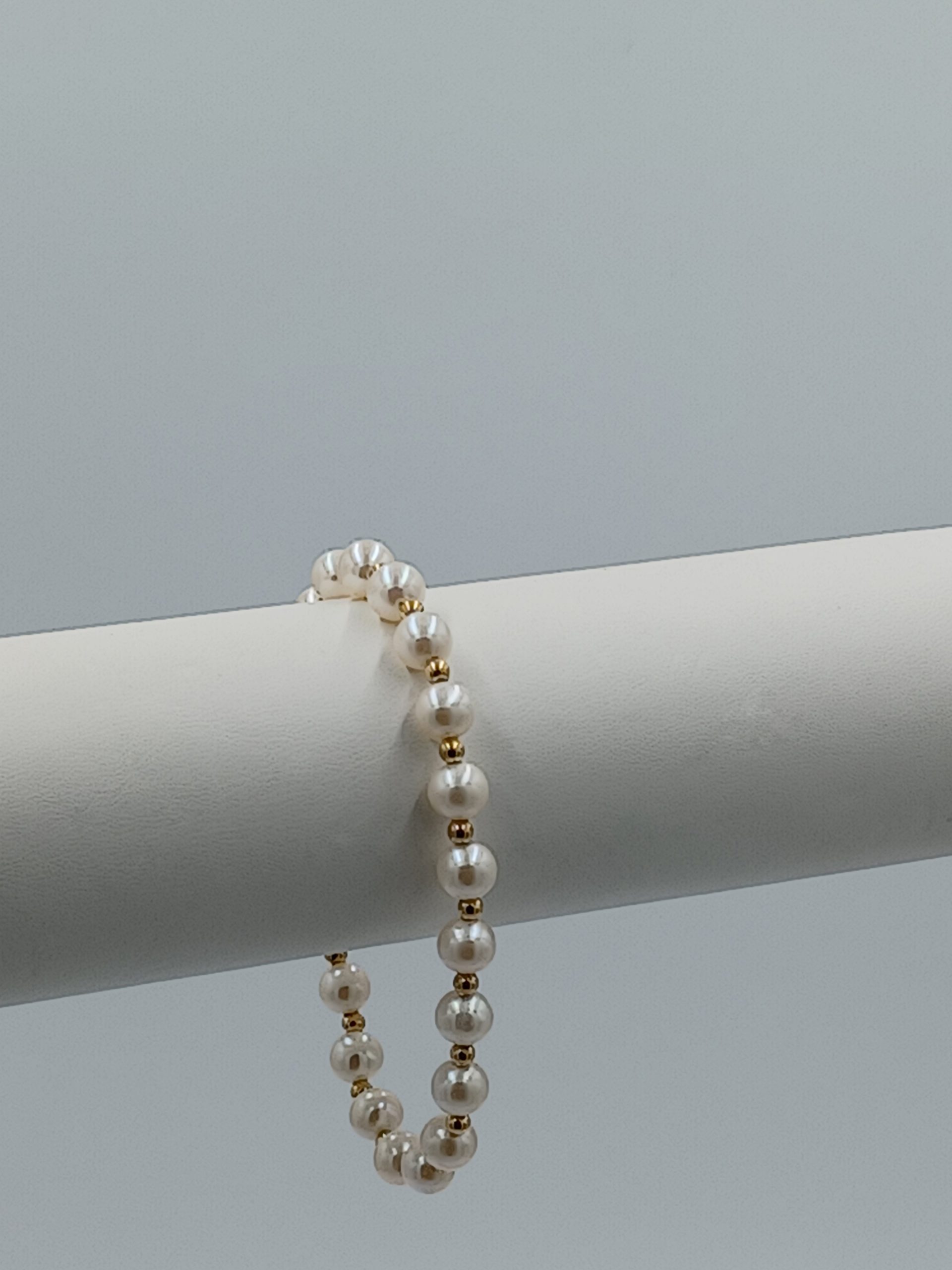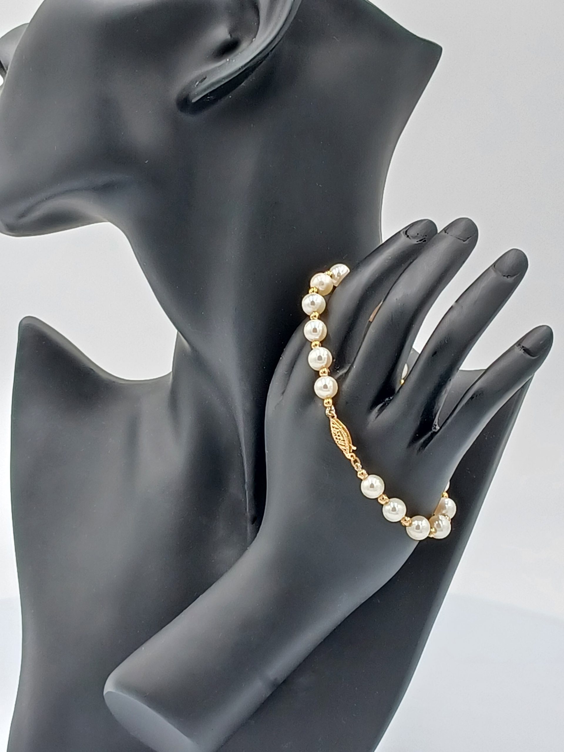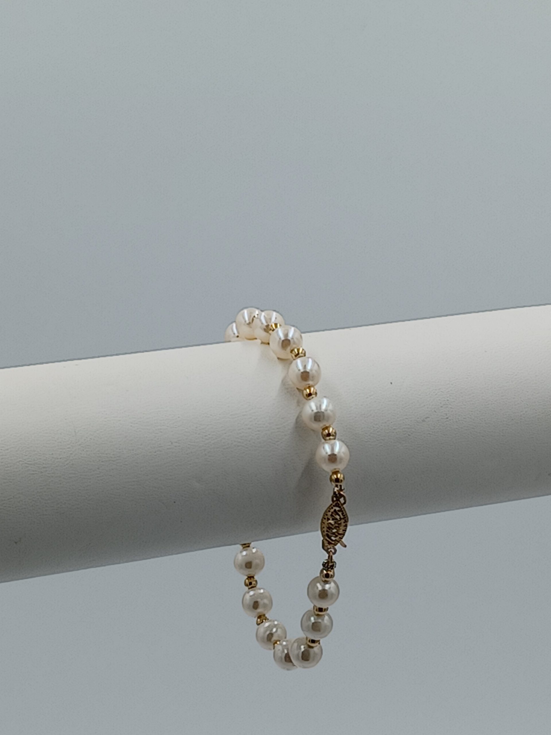 Beautiful. Hi-luster 6.5mm-7.0mm cultured Sea pearls and 14kt gold beads complement each other in this ornate bracelet. Chinese knotted with silk. Beautifully ornate 14kt gold clasp with safety feature. 7.75” in length.