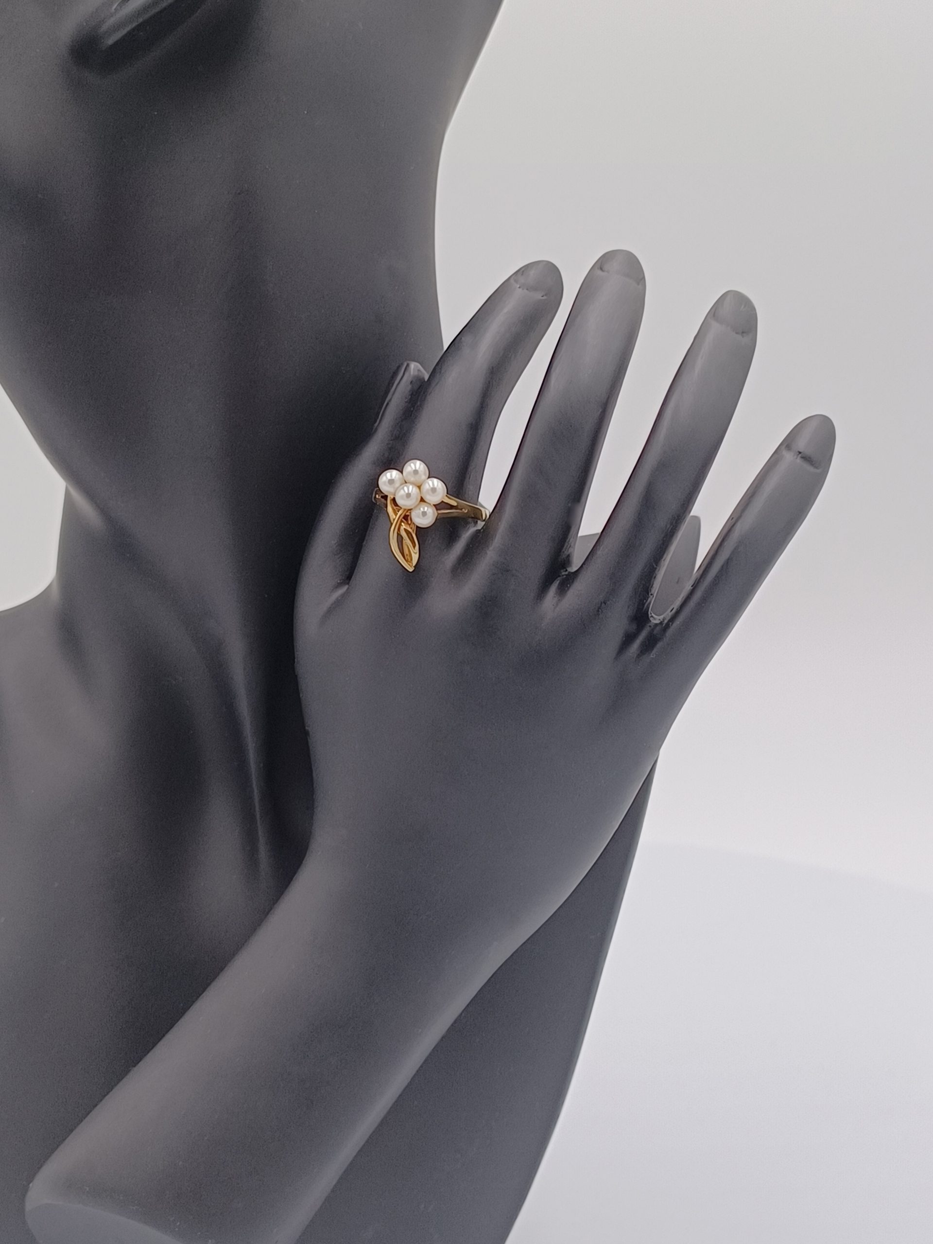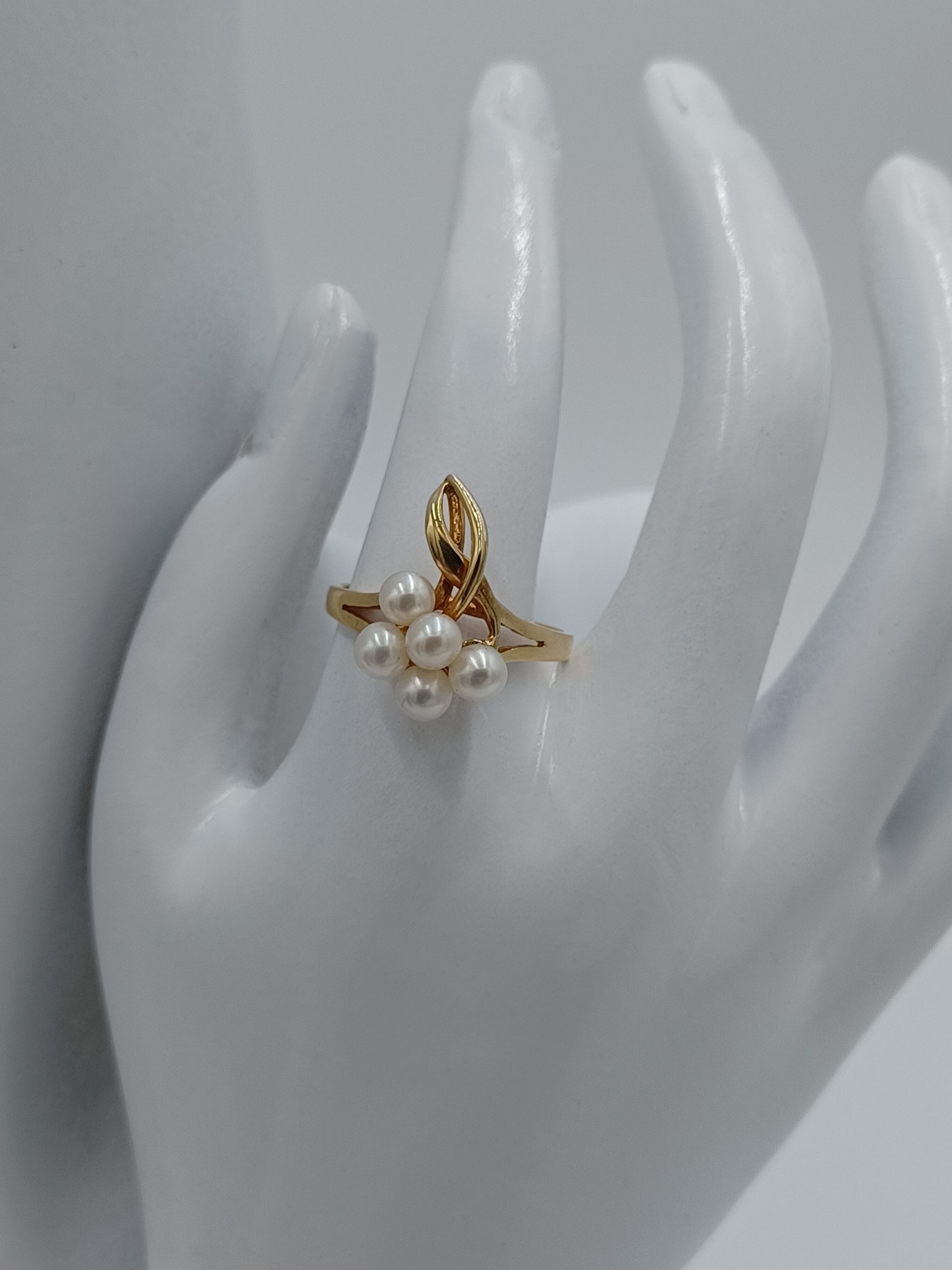 Beautiful delicate 14kt gold ring with an array of salt water cultured pearls in a flower design.Great for pinkie or any finger.Size: 6.5. Can be re-sized (by a jeweler).