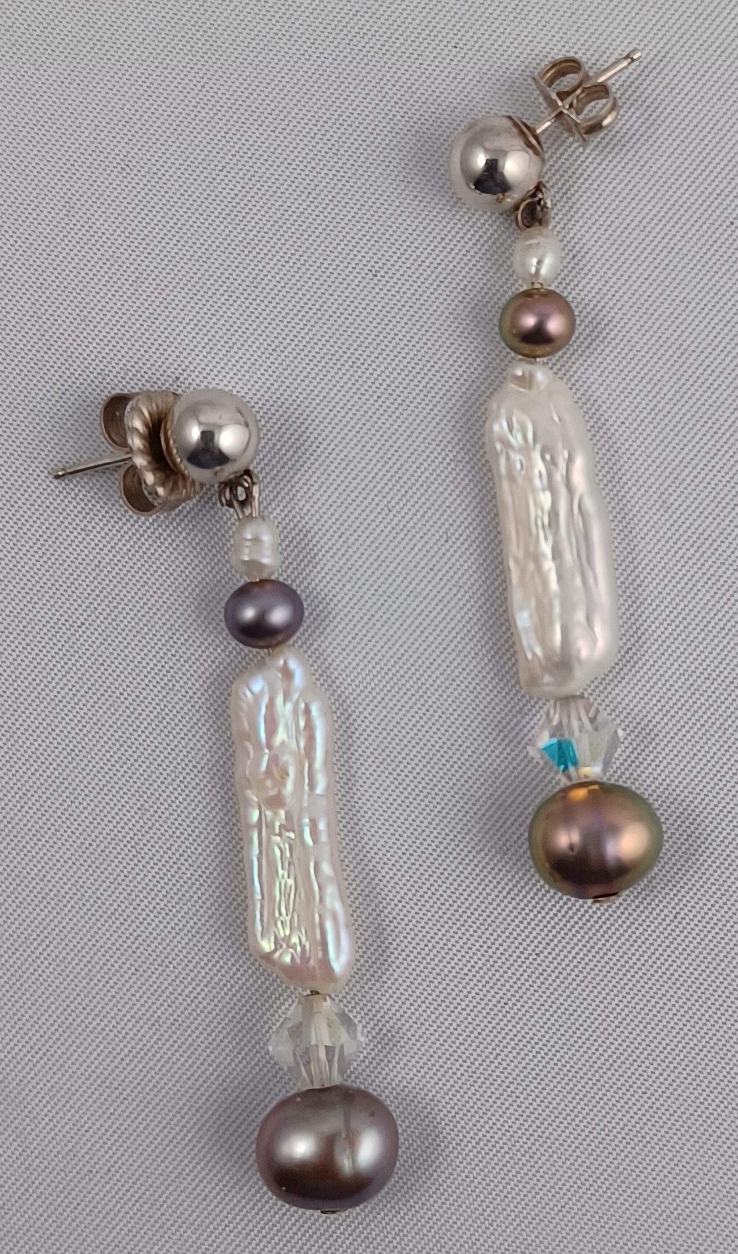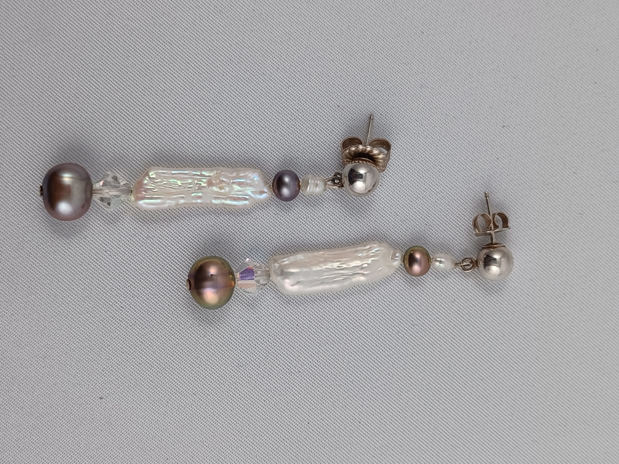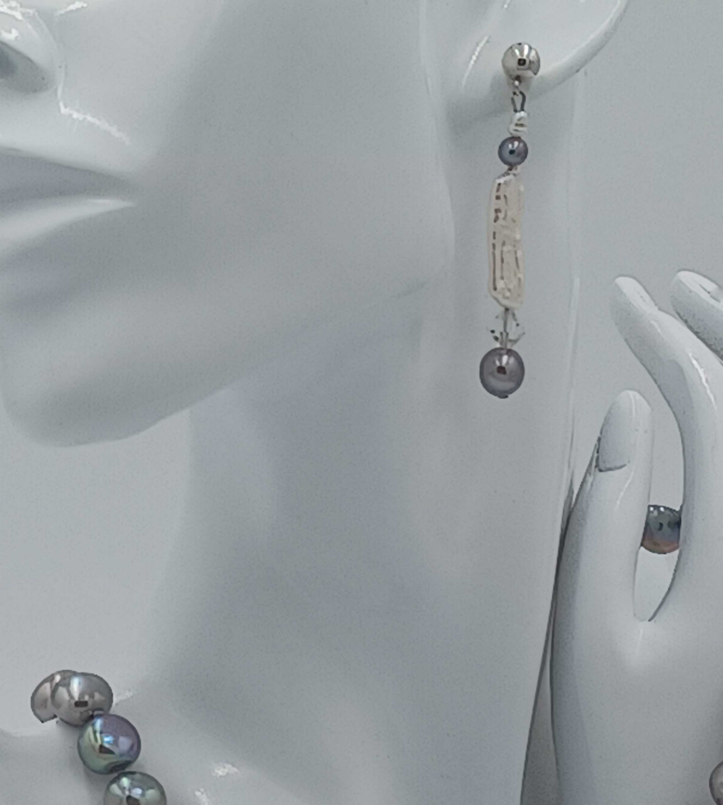 bi-cone shapes, along with hi-luster silver peacock baroque pearls. Hanging from sterling silver round post.