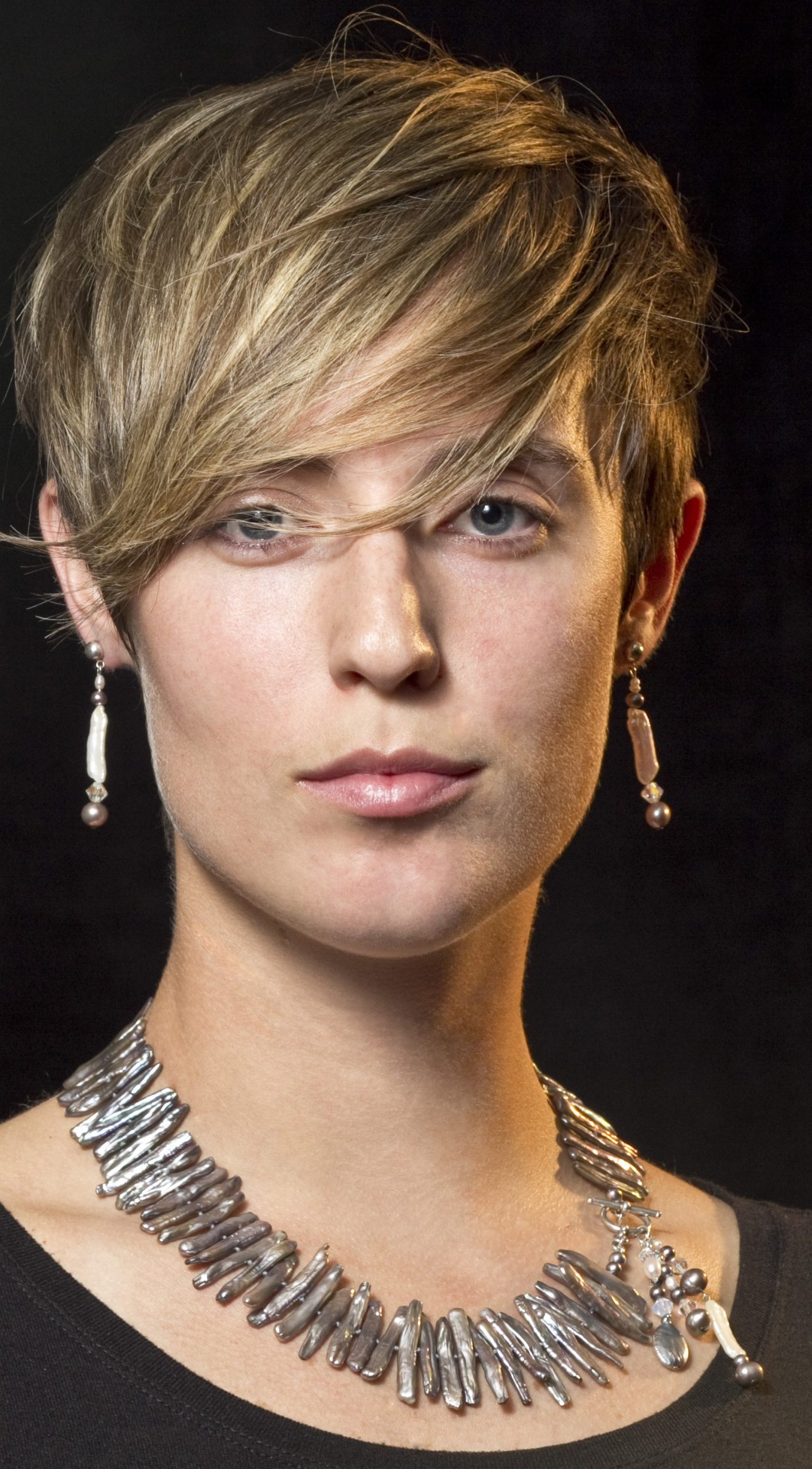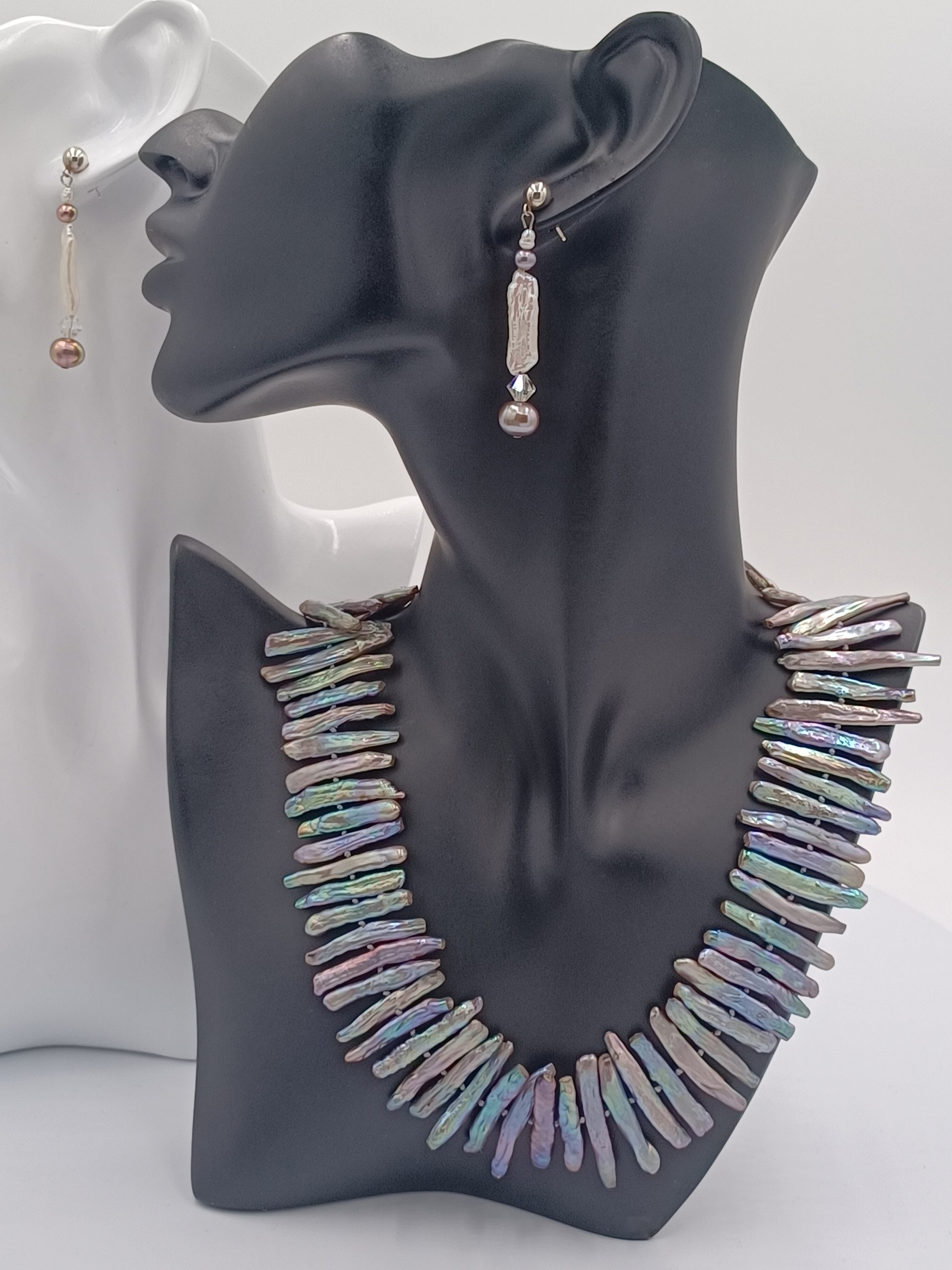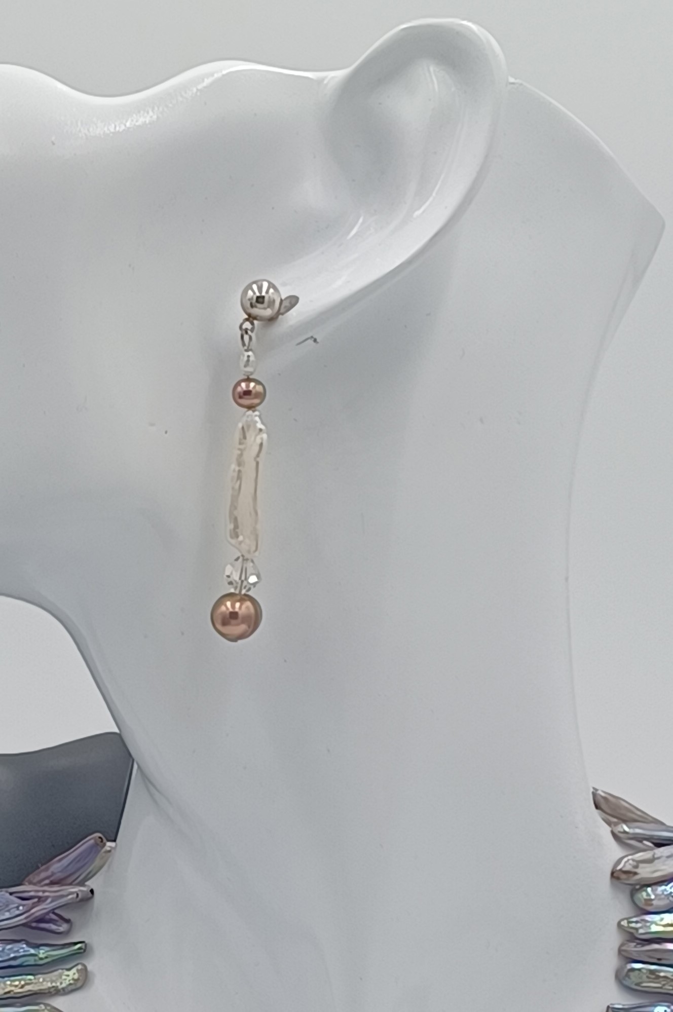 bi-cone shapes, along with hi-luster silver peacock baroque pearls. Hanging from sterling silver round post.