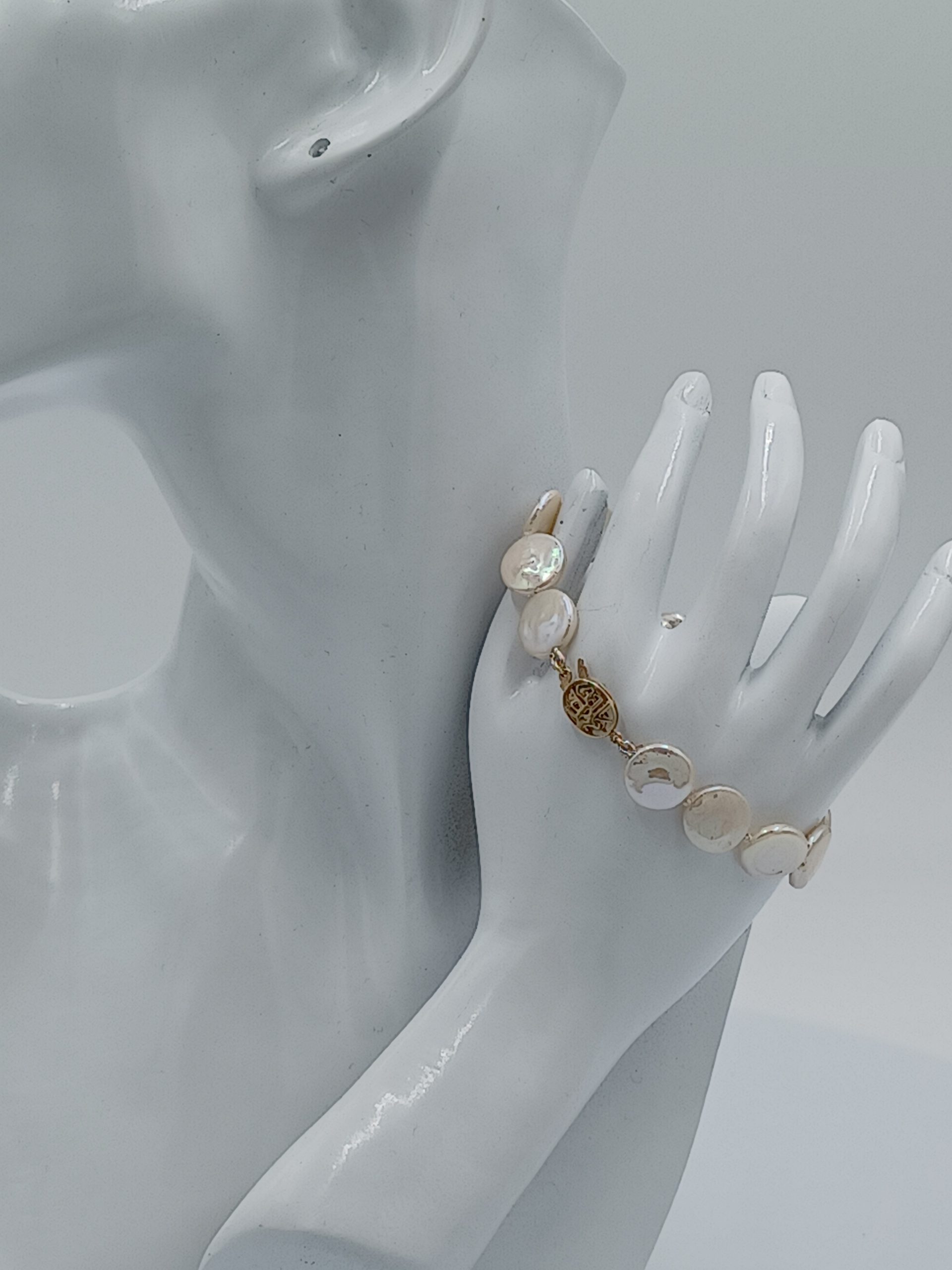 Extreme hi-luster. Large 14kt gold filigree clasp. 7.5″ in length.