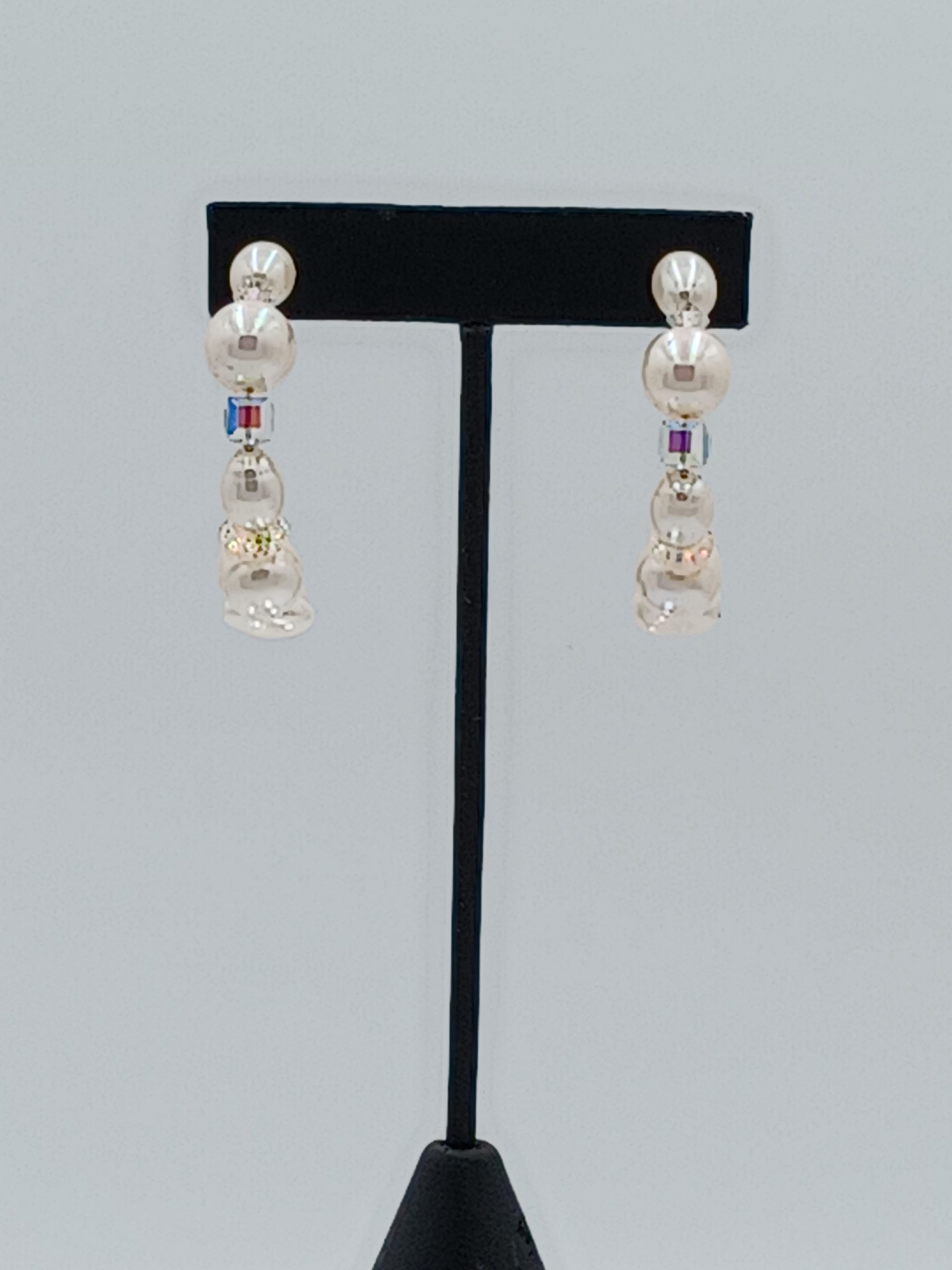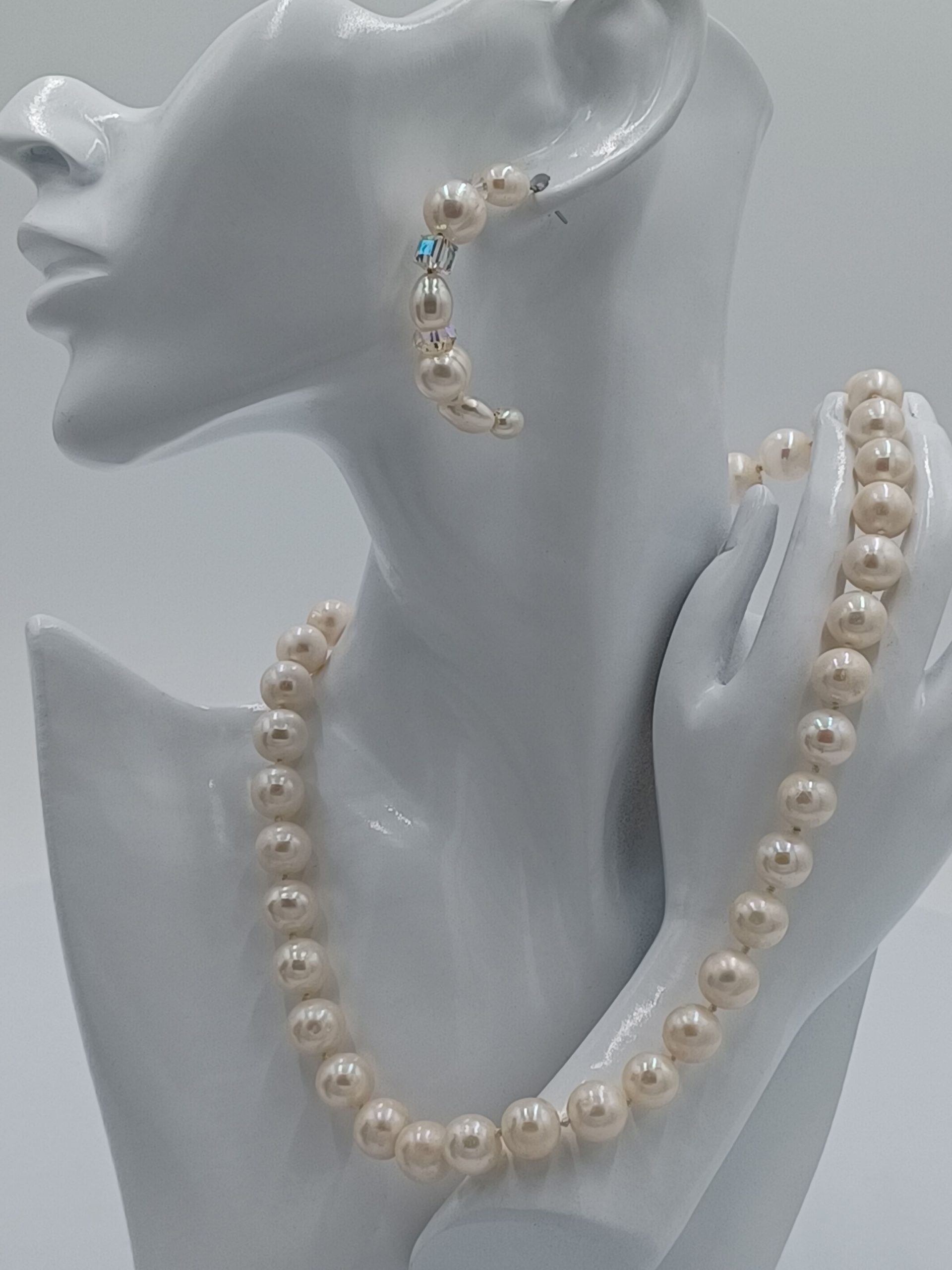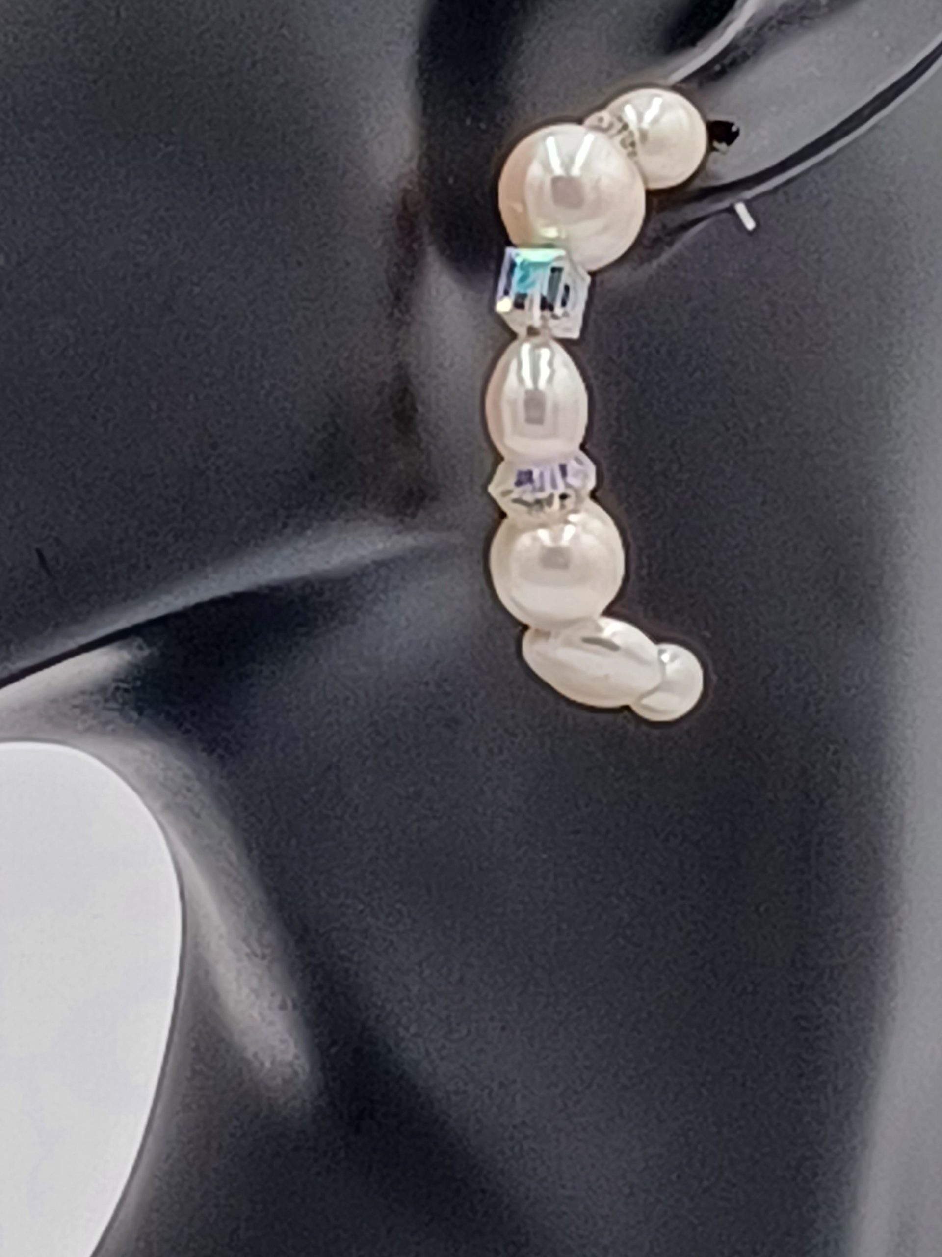 Gorgeous variety of hi-luster baroque 7.0-11.0mm cultured pearls and a variety of Swarovski crystals, from cube, bi-cone, rondelle make up this unique creation! Versatile! 1.5” diameter drop length.